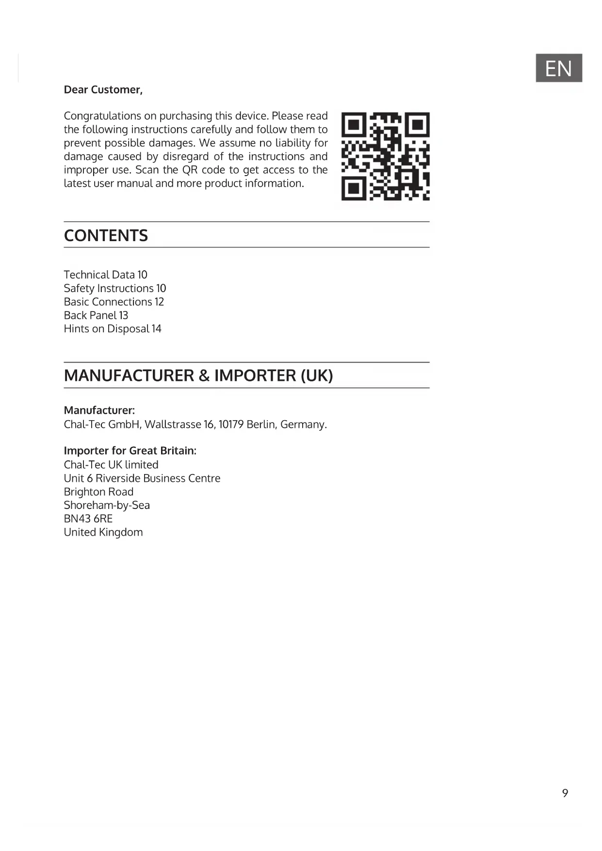 Dear Customer, Congratulations on purchasing this device. Please read the following instructions carefully and follow them to prevent possible damages. We assume no liability for damage caused by disregard of the instructions and improper use. Scan the QR code to get access to the latest user manual and more product information. CONTENTS MANUFACTURER & IMPORTER (UK) Manufacturer: Chal-Tec GmbH, Wallstrasse 16, 10179 Berlin, Germany. Importer for Great Britain: Chal-Tec UK limited Unit 6 Riverside Business Centre Brighton Road Shoreham-by-Sea BN43 6RE United Kingdom Technical Data 10 Safety Instructions 10 Basic Connections 12 Back Panel 13 Hints on Disposal 1410
