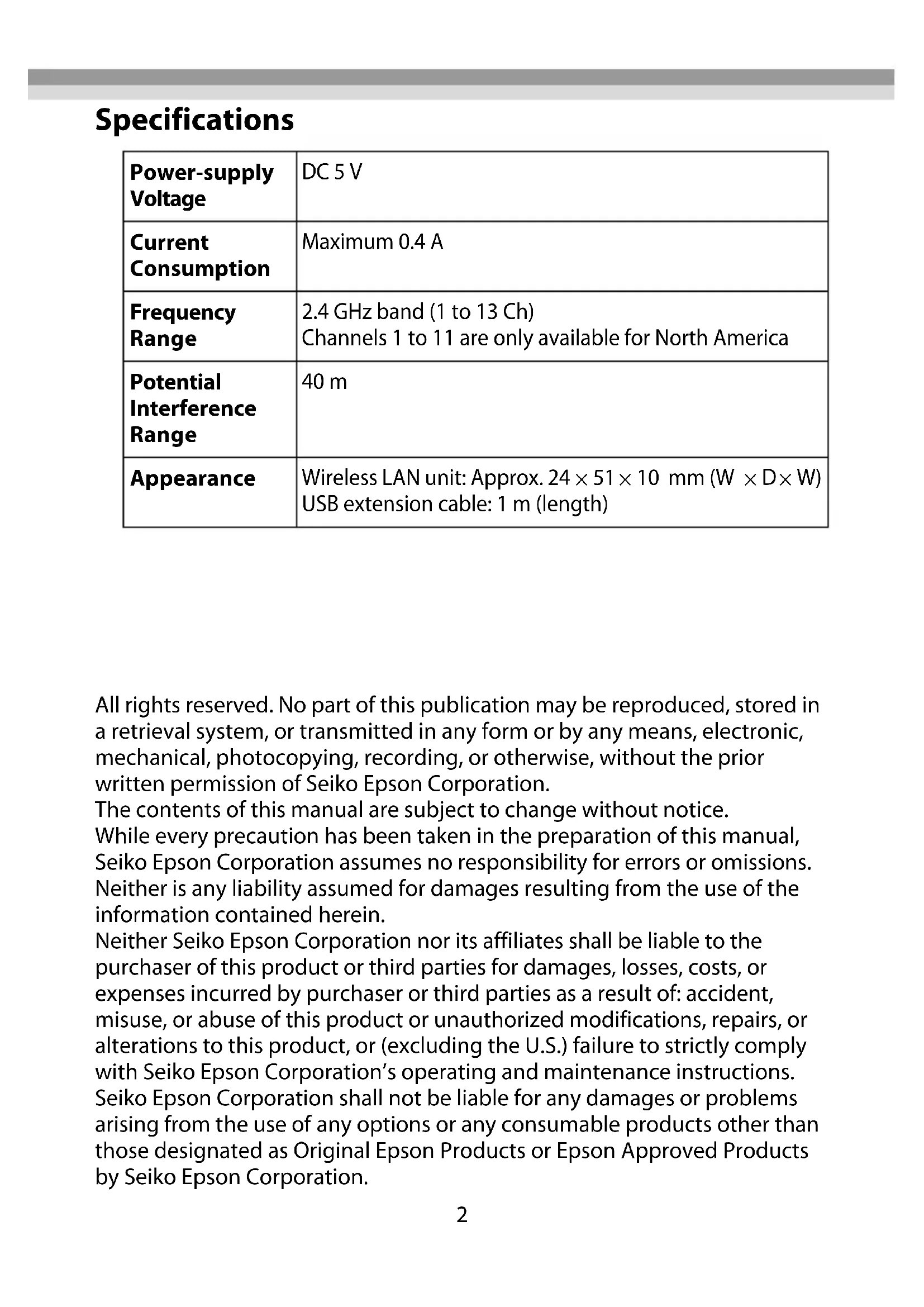 使用手冊 ............................................................ 362 Specifications All rights reserved. No part of this publication may be reproduced, stored in a retrieval system, or transmitted in any form or by any means, electronic, mechanical, photocopying, recording, or otherwise, without the prior written permission of Seiko Epson Corporation. The contents of this manual are subject to change without notice. While every precaution has been taken in the preparation of this manual, Seiko Epson Corporation assumes no responsibility for errors or omissions. Neither is any liability assumed for damages resulting from the use of the information contained herein. Neither Seiko Epson Corporation nor its affiliates shall be liable to the purchaser of this product or third parties for damages, losses, costs, or expenses incurred by purchaser or third parties as a result of: accident, misuse, or abuse of this product or unauthorized modifications, repairs, or alterations to this product, or (excluding the U.S.) failure to strictly comply with Seiko Epson Corporation’s operating and maintenance instructions. Seiko Epson Corporation shall not be liable for any damages or problems arising from the use of any options or any consumable products other than those designated as Original Epson Products or Epson Approved Products by Seiko Epson Corporation. Power-supply Voltage DC 5 V Current Consumption Maximum 0.4 A Frequency Range