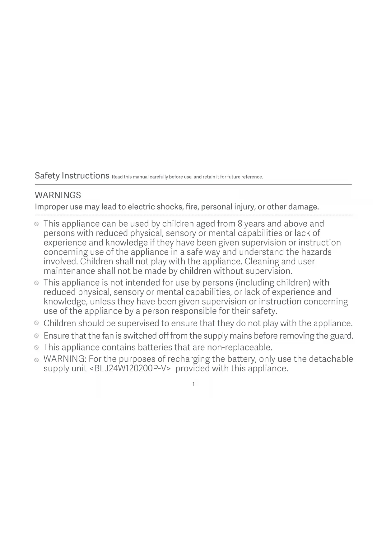 supply unit <BLJ24W120200P-V> provided with this appliance.2 Do not use this fan if the power cord of the charging base is damaged or its power plug is loose. Do not operate any fan with a damaged cord or plug. Discard fan or return to an authorized service facility for examination and/or repair. Do not use this fan in a place where it will easily fall over or where there are other unstable objects nearby. Do not excessively pinch, bend, or twist the power cord of the charging base as this may expose or break its core. Do not insert your fingers or any object into the front grille, rear grille, or the fan blades when the fan is in use. Keep hair and fabrics away from the fan to avoid geing them caught in the fan. Under normal use of condition, this equipment should be kept a separation distance of at least 20 cm between the antenna and the body of the user. This appliance contains built-in li-ion baery. Do not disassemble, impact, crush the baery or throw it into fire. If there is severe swelling, do not continue to use. Do not leave the baery in high temperature environment.3 Do not use any improper power outlet. Do not use the charging base provided with this fan for any other device. Prior to cleaning or other maintenance, the appliance must be disconnected from the supply mains. Do not improperly dispose of old baeries. Used baeries should be discarded at a professional recycling facility. Do not charge the fan on uneven places or plush materials. Otherwise, it is easy to cause circuit failure or fire due to poor contact between the charging base and the charging port.To avoid electric shocks, fire, personal injury, or other damage, make sure the fan base is installed last. Please follow the installation instructions in the user manual. Do not turn on the fan or connect it to the charging base if it is not completely assembled. Turn off or unplug the fan before installing or disassembling it. Do not touch the on/off buon to prevent the fan from running and causing danger. Installation Firmly hold the fan stand to avoid it from falling down and causing personal injury. Using the Fan Do not lean on or tilt the fan while it is running. Do not shake the fan's head repeatedly so as to avoid damage to the internal mechanism. Immediately stop using the fan if it makes unusual sounds, gives off bad odors, overheats, or rotates irregularly. Charging the Fan Do not unplug the charging base by directly pulling at the cord or wiggling it out of the outlet. Instead, pull the plug out itself. When the baery is depleted, the fan should be charged as soon as possible. To prevent the baery from being damaged, connect the charging base to the fan base in a timely manner. Do not aempt to repair the charging base by yourself if it is damaged. When the charging base is damaged or broken, it must be replaced with a genuine one purchased from the manufacturer or aer-sales service department. When the fan is charging, the fan base may get warm. It is recommended to charge the fan on insulating materials or in places that are not easily affected by heat sources, so as to prevent the places where the fan is put from becoming discolored or deformed. Care & Maintenance When maintaining and cleaning the fan, make sure to remove the fan base first before removing other parts and to install the fan base last when installing. Make sure the fan is unplugged before removing the protective cover. PRECAUTIONS Transportation