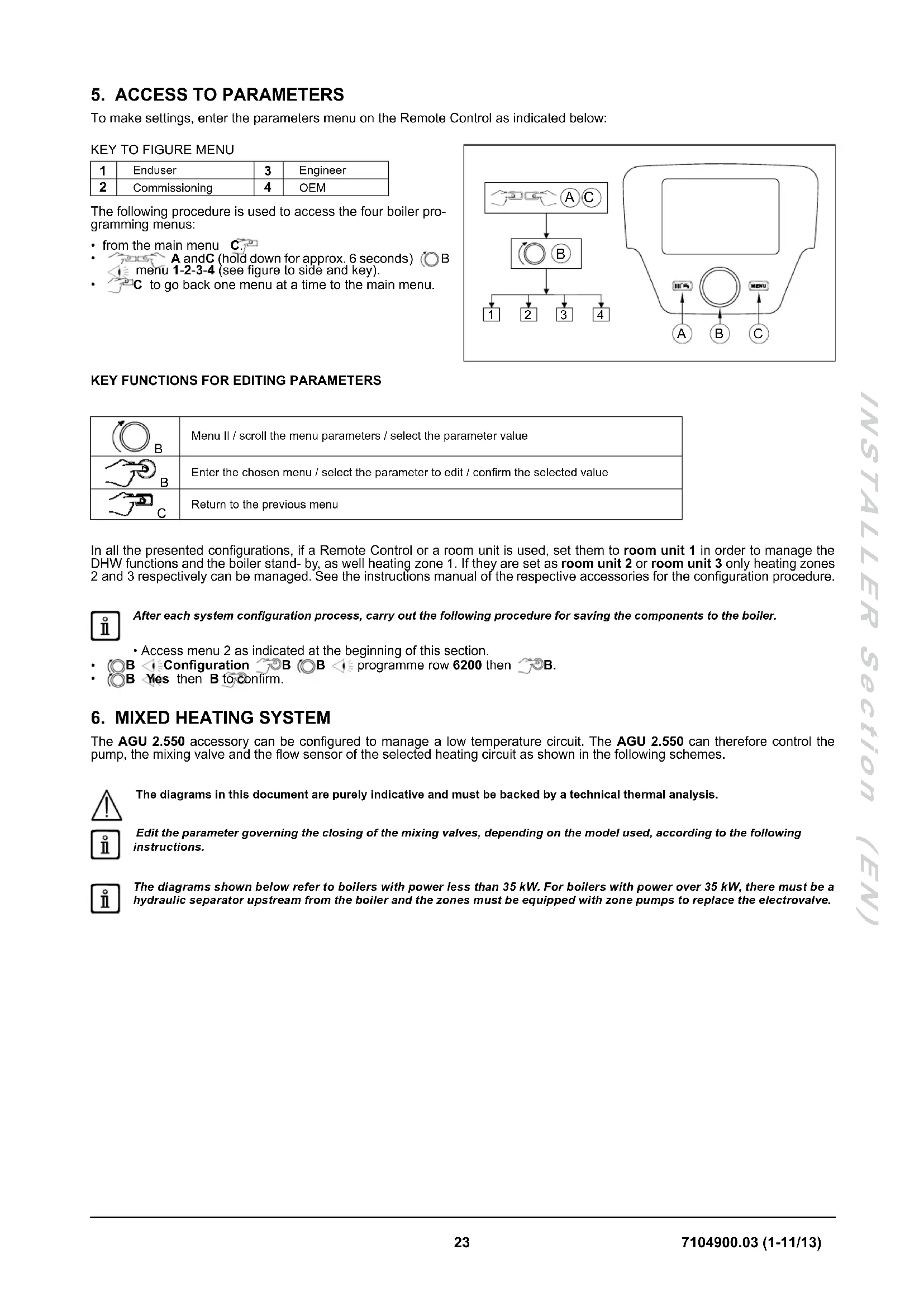 Enter menu 2 from the Remote Control as described in section 5, and make the following settings: MENU PROGRAMME ROW PARAMETER VALUE TO SET DESCRIPTIONCONFIGURATION5715 Heating circuit 2 On Heating circuit 2 enable5977 H5 input functionRoom thermostat CH2 Circuit 2 thermostat enable(terminal block M1 (1-2) on boiler)6020 Extension module 1 functionTemps / mode CH1 Low temperature zone enable Function of H2 input on module 1Room thermostat CH1 H2 input enabled as low temperature zone room thermostatHEATING CIRCUIT 1710 Comfort temperature 35°C Room setpoint (low temperature zone)HEATING CIRCUIT 1 834 Actuator stroke time: Default 180 s Mixing valve close time Set the comfort temperature to it maximum value (35°C) to ensure the low temperature zones work correctly. This ensures that the room unit does not block the heat demand of the individual room thermostats managing the subzones. In this case, the room unit manages the low temperature system, but it cannot be used to manage the temperature of one of the rooms. Turn knob B to display the boiler ow temperature. The heating circuit operates with a xed ow. Connect the thermostat protecting the low temperature zone in series to the feed of the zone electrovalves so as to totally close the circuit in case of fault.7104900.03 (1-11/13) 26 INSTALLER Section (EN)