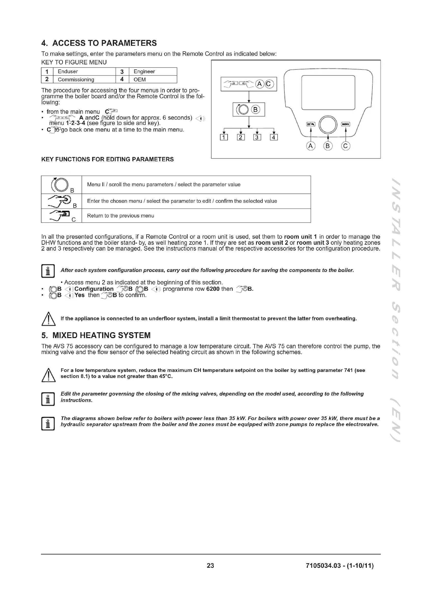 The procedure for accessing the four menus in order to programme the boiler board and/or the Remote Control is the following: