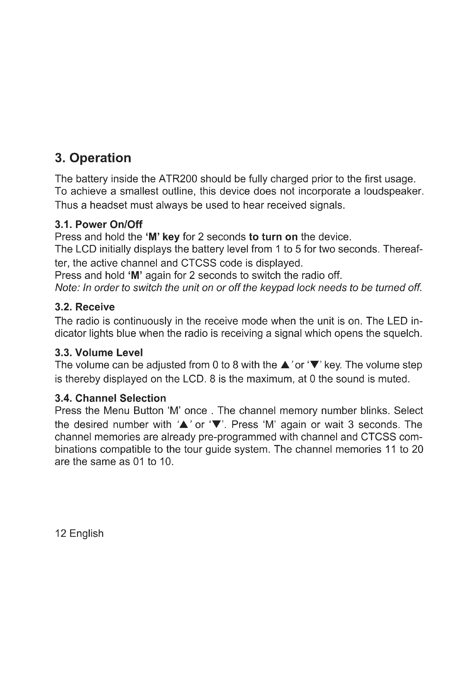 The battery inside the ATR200 should be fully charged prior to the rst usage. To achieve a smallest outline, this device does not incorporate a loudspeaker. Thus a headset must always be used to hear received signals. 3.1. Power On/Off Press and hold the ‘M’ key for 2 seconds to turn on the device. The LCD initially displays the battery level from 1 to 5 for two seconds. Thereaf- ter, the active channel and CTCSS code is displayed. Press and hold ‘M’ again for 2 seconds to switch the radio off. Note: In order to switch the unit on or off the keypad lock needs to be turned off. 3.2. Receive The radio is continuously in the receive mode when the unit is on. The LED in- dicator lights blue when the radio is receiving a signal which opens the squelch. 3.3. Volume Level The volume can be adjusted from 0 to 8 with the ’ or ‘’ key. The volume step is thereby displayed on the LCD. 8 is the maximum, at 0 the sound is muted. 3.4. Channel Selection Press the Menu Button ‘M’ once . The channel memory number blinks. Select the desired number with ‘’ or ‘’. Press ‘M’ again or wait 3 seconds. The channel memories are already pre-programmed with channel and CTCSS com- binations compatible to the tour guide system. The channel memories 11 to 20 are the same as 01 to 10.13English 3.5. Battery level display Whenever the device is turned on, the state of charge (1 to 5) is displayed for two seconds. If the device is already switched on, the device must be briey switched off and on again. 3.6. Charging the Device Connect the Micro-USB jack of the ATR200 with the respective cable to the USB AC- adapter or to another USB Source. During charging, the status LED lights red. The LED turns off when the battery is fully charged.14 English