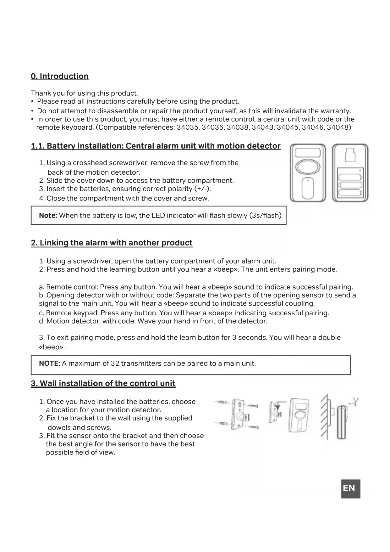 - In order to use this product, you must have either a remote control, a central unit with code or the remote keyboard. (Compatible references: 34035, 34036, 34038, 34043, 34045, 34046, 34048) 1.1. Battery installation: Central alarm unit with motion detector