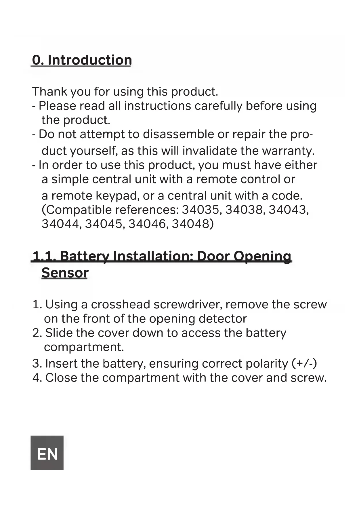 Thank you for using this product. - Please read all instructions carefully before using the product. - Do not attempt to disassemble or repair the pro- duct yourself, as this will invalidate the warranty. - In order to use this product, you must have either a simple central unit with a remote control or a remote keypad, or a central unit with a code. (Compatible references: 34035, 34038, 34043, 34044, 34045, 34046, 34048) 1.1. Battery Installation: Door Opening Sensor