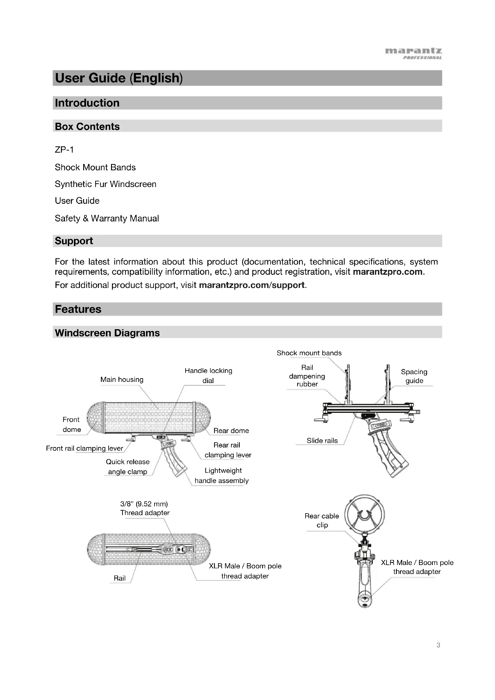 User Guide (English) Introduction Box Contents ZP-1 Shock Mount Bands Synthetic Fur Windscreen User Guide Safety & Warranty Manual Support For the latest information about this product (documentation, technical specifications, system requirements, compatibility information, etc.) and product registration, visit marantzpro.com. For additional product support, visit marantzpro.com/support. Features Windscreen Diagrams