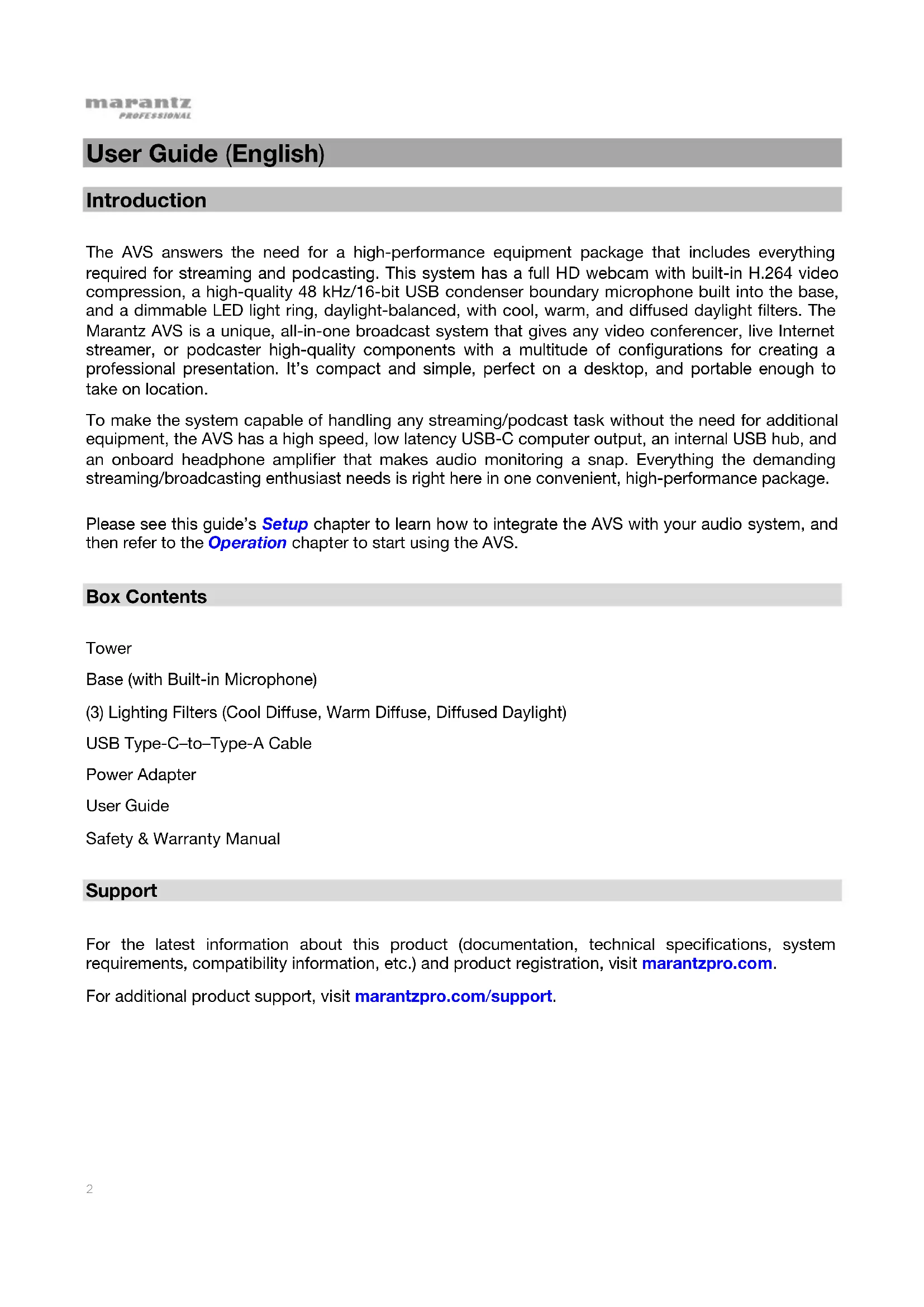 User Guide (English) Introduction The AVS answers the need for a high-performance equipment package that includes everything required for streaming and podcasting. This system has a full HD webcam with built-in H.264 video compression, a high-quality 48 kHz/16-bit USB condenser boundary microphone built into the base, and a dimmable LED light ring, daylight-balanced, with cool, warm, and diffused daylight filters. The Marantz AVS is a unique, all-in-one broadcast system that gives any video conferencer, live Internet streamer, or podcaster high-quality components with a multitude of configurations for creating a professional presentation. It’s compact and simple, perfect on a desktop, and portable enough to take on location. To make the system capable of handling any streaming/podcast task without the need for additional equipment, the AVS has a high speed, low latency USB-C computer output, an internal USB hub, and an onboard headphone amplifier that makes audio monitoring a snap. Everything the demanding streaming/broadcasting enthusiast needs is right here in one convenient, high-performance package. Please see this guide’s Setup chapter to learn how to integrate the AVS with your audio system, and then refer to the Operation chapter to start using the AVS. Box Contents Tower Base (with Built-in Microphone) (3) Lighting Filters (Cool Diffuse, Warm Diffuse, Diffused Daylight) USB Type-C–to–Type-A Cable Power Adapter User Guide Safety & Warranty Manual Support For the latest information about this product (documentation, technical specifications, system requirements, compatibility information, etc.) and product registration, visit marantzpro.com. For additional product support, visit marantzpro.com/support.3