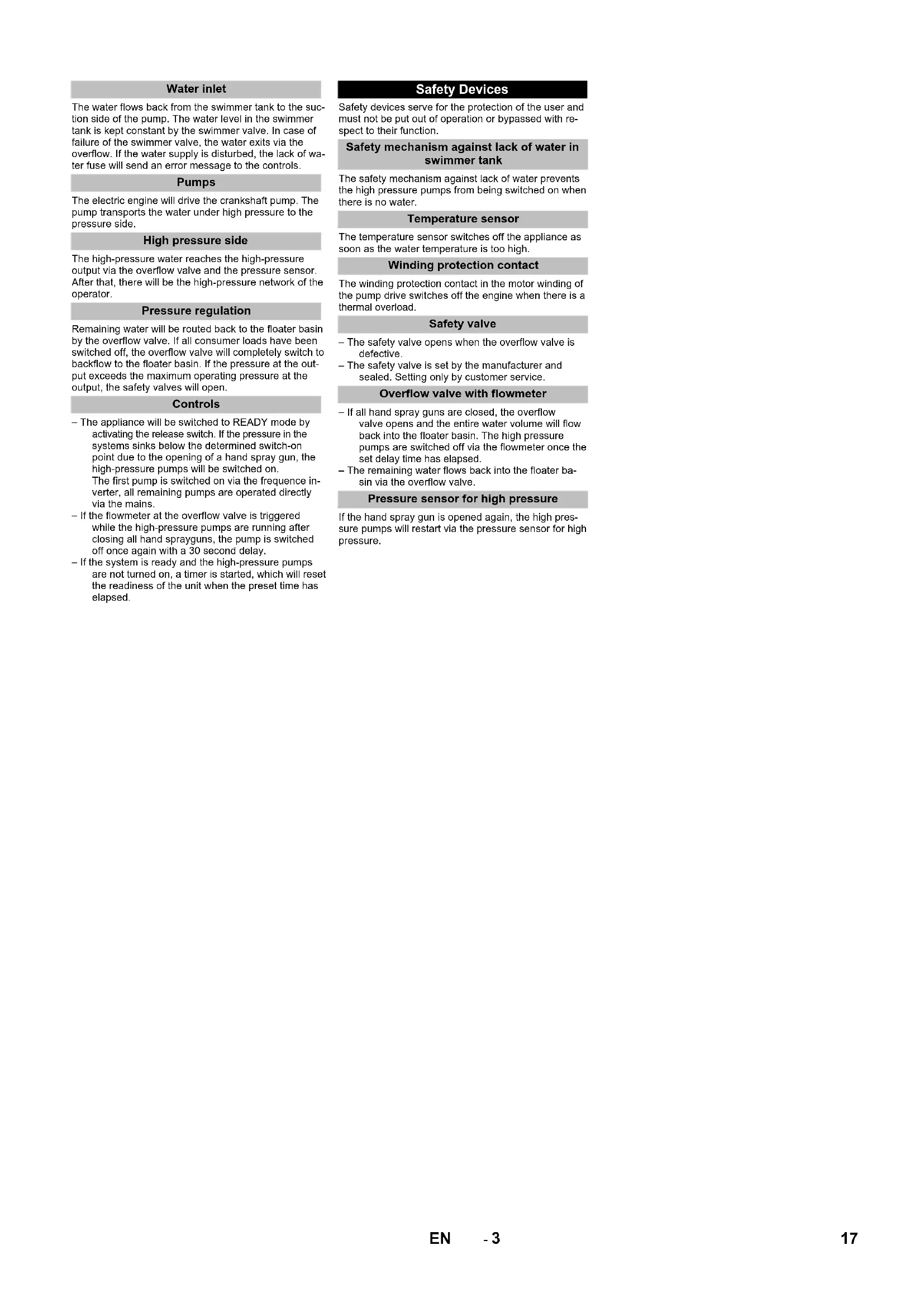 Wasserversorgung pH-Wert 6,5...9,5elektrische Leitfähigkeit < 2000 µS/cmabsetzbare Stoffe < 0,5 mg/l *abfiltrierbare Stoffe (Korngröße unter 0,025 mm)< 20 mg/lKohlenwasserstoffe < 20 mg/lChlorid < 300 mg/lCalcium < 85 mg/l **Gesamthärte < 15 °dH **Eisen < 0,5 mg/lMangan < 0,05 mg/lKupfer < 0,02 mg/lfrei von üblen Gerüchen Elektrischer Anschluss EU-Konformitätserklärung Produkt: HochdruckreinigerTyp: 2.509-xxxEinschlägige EU-Richtlinien2006/42/EG (+2009/127/EG)2009/125/EG2011/65/EU2014/30/EUAngewandte harmonisierte NormenEN IEC 63000: 2018EN 55014–1: 2017 + A11: 2020EN 55014–2: 2015EN 60335–1EN 60335–2–79EN 61000–3–2: 2014EN 61000–3–3: 2013EN 61000–3–12: 2011EN 61000–6–2: 2005EN 61000–6–4: 2007EN 62233: 2008Angewandte Verordnung(en)(EU) 2019/1781 Garantie Chairman of the Board of ManagementDirector Regulatory Affairs & Certification 13DE- 12 Kundendienst Anlagentyp: Herstell-Nr.: Inbetriebnahme am: Prüfung durchgeführt am: Befund: Unterschrift Prüfung durchgeführt am: Befund: Unterschrift Prüfung durchgeführt am: Befund: Unterschrift Prüfung durchgeführt am: Befund: Unterschrift 14 DE- 1 Please read and comply with these origi- nal instructions prior to the initial opera- tion of your appliance and store them for later use or subsequent owners. – Before first start-up it is definitely necessary to read the safety indications Nr. 5.956-309.0! – In case of transport damage inform vendor imme- diately. Notes about the ingredients (REACH) You will find current information about the ingredients at: www.kaercher.com/REACH DANGER Pointer to immediate danger, which leads to severe in- juries or death. 몇 WARNING Pointer to a possibly dangerous situation, which can lead to severe injuries or death. 몇 CAUTION Pointer to a possibly dangerous situation, which can lead to minor injuries. ATTENTION Pointer to a possibly dangerous situation, which can lead to property damage. – Please follow the national rules and regulations for fluid spray jets of the respective country. – Please follow the national rules and regulations for accident prevention of the respective country. Fluid spray jets must be tested regularly and the results of these tests must be documented in writing. – Please follow the safety instructions which are at- tached to the used detergents (normally on the packing label). The work station is located at the display. Depending on the plant installation, other work-stations are located at the accessories (spraying units) that are connected to the feeder points. – Wear protective clothing and safety goggles to pro- tect against splash back containing water or dirt. – This system transports water to the down-the-line high pressure units with high pressure. This unit is permanently installed in a dry room. There must be a water and a power connection present according to the details provided in the technical specifica- tions. The temperature at the installation site should not exceed 40 °C. The high pressure water is distributed through a fixed network of pipes. – Only clean water may be used as high pressure medium. Impurities will lead to increased wear and tear or formation of deposits in the appliance. – Above 15 °dH, measures for hardness reduction may become necessary. – The use of recycled water must be prearranged with Kärcher in advance. DANGER Risk of injury! Follow the respective safety regulations when operating at gas stations or other dangerous are- as. Contents Environmental protection EN 1 Danger or hazard levels EN 1 Symbols on the machine EN 1 Safety instructions EN 1 Proper use EN 1 Function EN 2 Safety Devices EN 3 Device elements EN 4 Start up EN 5 Operation EN 5 Shutdown EN 5 Technical specifications EN 6 Transport EN 8 Storage EN 8 Care and maintenance EN 8 Troubleshooting EN 9 Accessories EN 10 Installing the plant EN 11 EU Declaration of Conformity EN 11 Warranty EN 11 Customer Service EN 12 Environmental protection The packaging material can be recycled. Please do not throw the packaging mate- rial into household waste; please send it for recycling. Old appliances contain valuable materials that can be recycled; these should be sent for recycling. Batteries, oil, and similar substances must not enter the environ- ment. Please dispose of your old appli- ances using appropriate collection sys- tems. Please do not release engine oil, fuel oil, diesel and petrol into the environment Protect the ground and dis- pose of used oil in an environmentally-clean manner. Kärcher detergents are easy-to-dispose. This means that the functioning of an oil separator is not hampered. Please find a list of recommended detergents in the chapter "Accessories". Danger or hazard levels Symbols on the machine Risk of burns! Beware of hot com- ponents. Safety instructions Work-stations Personal safety gear Wear ear plugs to protect your ears against hearing loss while cleaning parts that produce high sound levels. Proper use Please do not let mineral oil contaminated waste water reach soil, water or the sewage system. Perform en- gine cleaning and bottom cleaning therefore only on specified places with an oil trap. 15EN- 2 1 Dirt catcher (at the site)2 Temperature sensor3 Water shortage safeguard4 Float tank5 Advance pressure pump(Option)6 Crankshaft pump7 Safety valve8 Electro motor9 Backflow valve10 High pressure hose11 Pressure sensor for high pressure12 Overflow valve13 Flowmeter14 Swimmer valve15 Locking tap (onsite)16 Locking tap (onsite)A Pipeline/high pressure outletB Water inletC Overflow Function Flow pattern