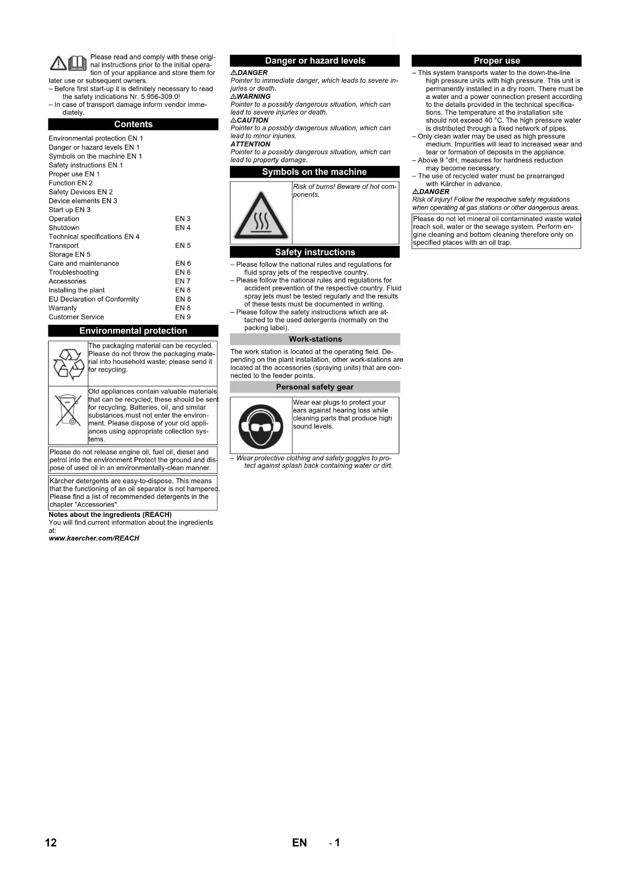 Indicator lamps Start up Operation Safety instructions 14 EN- 4 DANGERRisk to life on account of electric shock! Do not direct the water jet on the following equipment:– Electrical appliances and plants, – the unit itself, – all electricity-carrying parts in the working area. There is a recoil pressure arising from the water jet that comes out from the spray pipe. The angular spray pipe brings about an upward force. DANGER– Risk of injury! The recoil pressure of the spray pipe can throw you off-balance. You may fall. The spray jet can fly off and cause damage to persons. Search a secure place to stand and hold the gun firmly. Never hold on tightly to the lever of the hand spray gun.– The jet must not be directed at other persons or di-rected by the user at him/herself to clean clothing or footwear.– Risk of injury from parts flying off! Flying-off frag-ments or objects can injure people or animals. Nev-er direct the water jet on fragile or loose objects.– Risk of accident on account of damage! Clean tyres and valves from a minimum distance of 30 cm. DANGERDanger from substances that are harmful to health! Do not spray the following materials as they can swirl up substances that are harmful to health:– Materials containing asbestos,– Materials that could contain substances harmful to health. DANGER– Risk of injury on account of the emanating water jet that could be hot! Only original Kaercher high pres-sure hoses are optimally suited for the plant. No guarantee can be given if you use any other hoses.– Detergents can prove to be a health hazard! If any detergents are added, the water let out of the plant is not of potable quality.– Risk of hearing impairment while working on noise-making parts! If so, wear ear plugs.몇 WARNINGLong hours of using the appliance can cause circulation problems in the hands on account of vibrations.It is not possible to specify a generally valid operation time, since this depends on several factors:– Proneness to blood circulation deficiencies (cold, numb fingers).– Low ambient temperature. Wear warm gloves to protect hands.– A firm grip impedes blood circulation.– Continuous operation is worse than an operation interrupted by pauses.In case of regular, long-term operation of the device and in case of repeated occurrence of the symptoms (e.g. cold, numb fingers) please consult a physician. DANGERRisk of injury on account of the emanating water jet that could be hot! DANGERCheck the high pressure hose for damage before every use. Please arrange for the immediate replacement of a damaged high pressure hose. Check high pressure hose, pipe connections, fittings and water jet for damage every time before use. Check hose coupling to ensure that it sits firmly and is leak-proof. Turn the main switch to position “0”. Shut off water supply. Activate trigger gun until device is pressure-less. Open the water supply. Turn the main switch to position “1”. Press the unlocking key.Indicator lamp for operational readiness lights up. Perform the cleaning operation.Note: In case of a cleaning break of more than 30 sec-onds, the pump will turn off. At the same time, a 6-hour operation readiness period will be started. Within this operation readiness period, the appliance will automat-ically switch on because of the drop in pressure when the hand spray gun is opened. Press the unlocking key.Indicator lamp for operational readiness lights up. Turn the main switch to position “0”. Shut off water supply. Activate trigger gun until device is pressure-less. Secure the hand spray gun using the safety catch so that it doesn't open accidentally. If the appliance is not to be used for a longer period or if it is not possible to install it in a frost-free environment, you must take the following measures (see chapter "Maintenance and care", section "Anti-freeze protec-tion"): Drain water. Flush device with anti-freeze agent. Switch off the main switch and secure it.