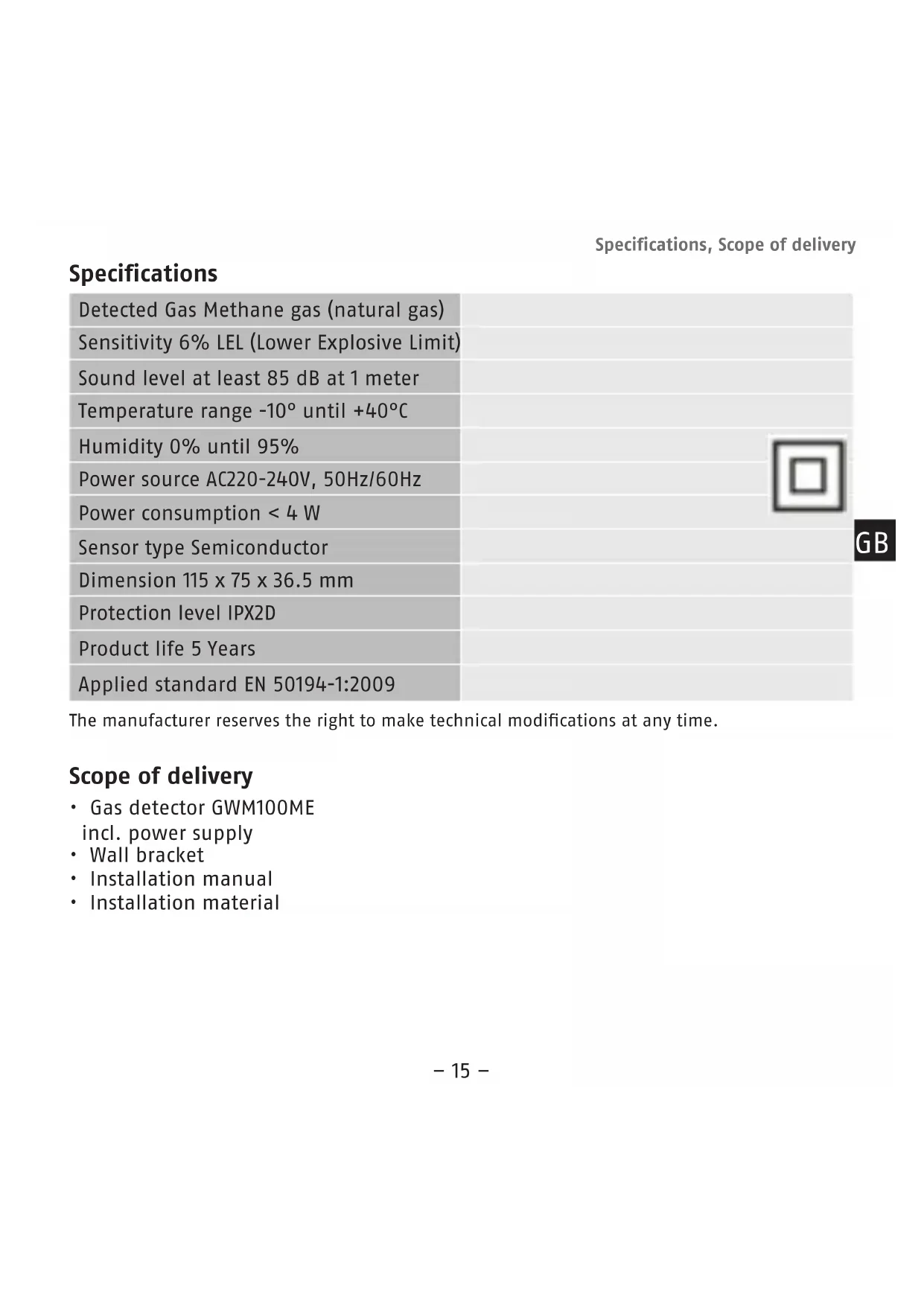 - Installationmaterial Detected Gas Methane gas (natural gas) Sensitivity 6% LEL (Lower Explosive Limit) Sound level at least 85 dB at 1 meter Temperature range -10° until +40°C Humidity 0% until 95% Power source AC220-240V, 50Hz/60Hz Power consumption <4W Sensor type Semiconductor Dimension 115 x 75 x 36.5 mm Protection level IPX2D Product life 5 Years Applied standard EN 50194-1:2009 Specifications, Scope of delivery GB– 16 – Explanation of symbols The following symbols are used in this manual: Warning