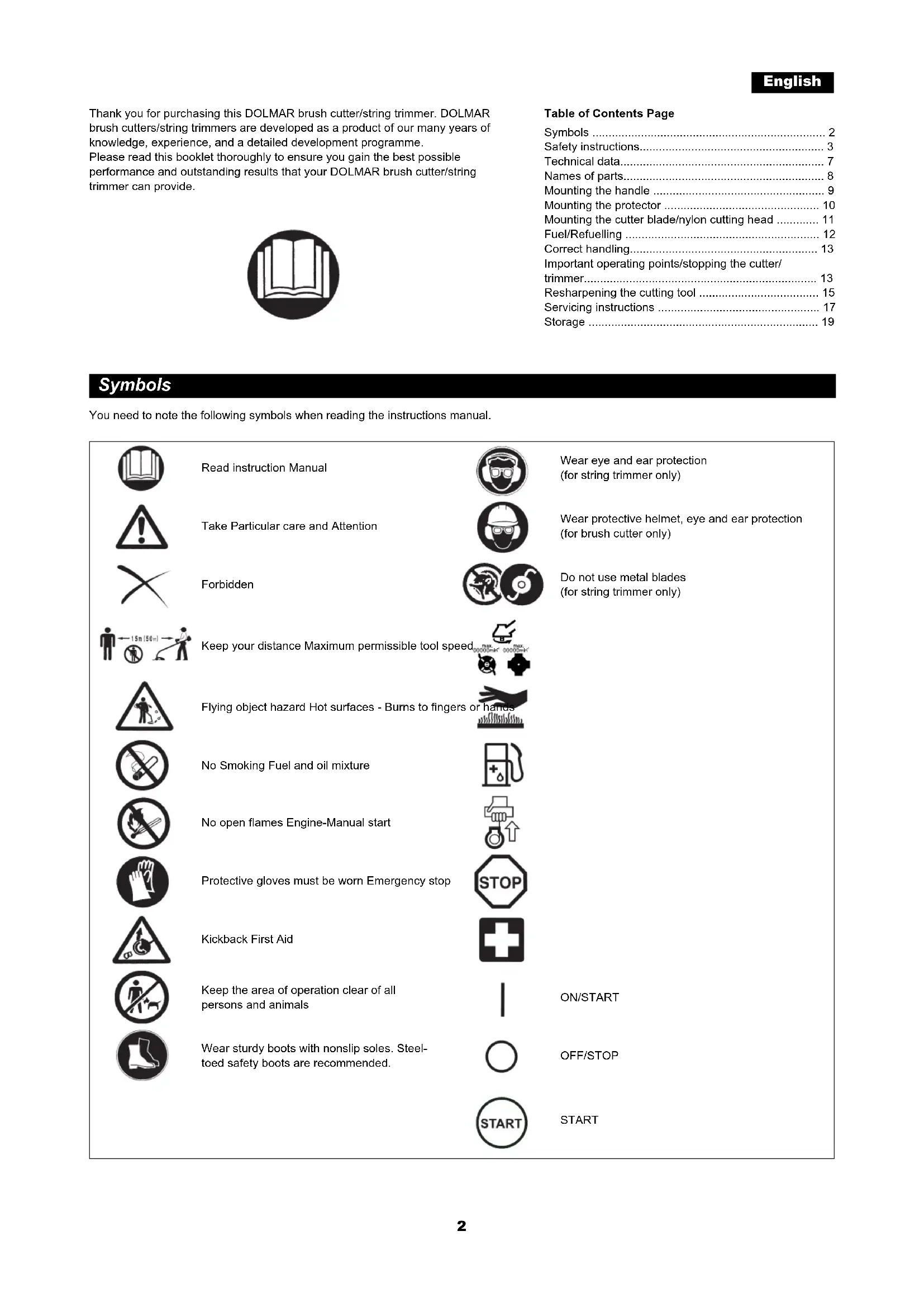 - Önemli: Yan tırpanı/misinalı yan tırpanı kullanmaya başlamadan önce bu kullanım kılavuzunu dikkatlice okuyun ve güvenlik talimatlarını harfiyen takip edin! Kullanım kılavuzunu dikkatlice saklayın! MS-27 U MS-27 C Original Instruction Manual Instructions d’emploi d’origine Originalbetriebsanleitung Manuale di istruzioni originale Originele gebruiksaanwijzing Instrucciones de manejo originales Instruções de serviço original Original brugsanvisning Πρωτότυπο εγχειρίδιο οδηγιών Orijinal Kullanım Kılavuzu2 Thank you for purchasing this DOLMAR brush cutter/string trimmer. DOLMAR brush cutters/string trimmers are developed as a product of our many years of knowledge, experience, and a detailed development programme. Please read this booklet thoroughly to ensure you gain the best possible performance and outstanding results that your DOLMAR brush cutter/string trimmer can provide. You need to note the following symbols when reading the instructions manual. Symbols Read instruction Manual Wear eye and ear protection (for string trimmer only) Take Particular care and Attention Wear protective helmet, eye and ear protection (for brush cutter only) Forbidden Do not use metal blades (for string trimmer only) Keep your distance Maximum permissible tool speed Flying object hazard Hot surfaces - Burns to fingers or hands No Smoking Fuel and oil mixture No open flames Engine-Manual start Protective gloves must be worn Emergency stop Kickback First Aid Keep the area of operation clear of all persons and animals ON/START Wear sturdy boots with nonslip soles. Steel- toed safety boots are recommended. OFF/STOP START Table of Contents Page Symbols p. 2