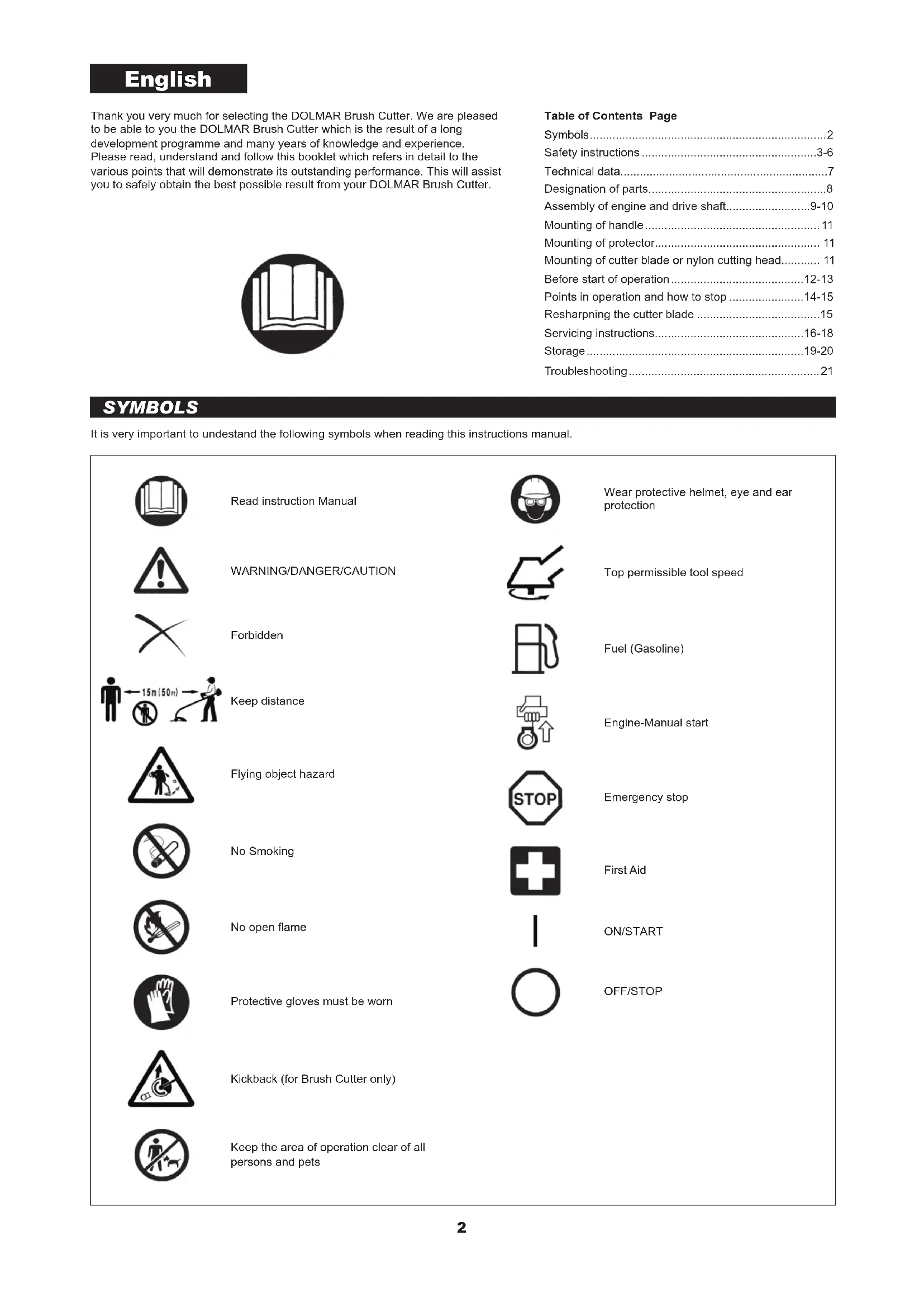 Keep distance Flying object hazardNo SmokingNo open ameProtective gloves must be wornKickback (for Brush Cutter only)Keep the area of operation clear of all persons and petsWear protective helmet, eye and ear protectionTop permissible tool speedFuel (Gasoline)Engine-Manual startEmergency stopFirst AidON/STARTOFF/STOP3 SAFETY INSTRUCTIONS General Instructions – To ensure correct and safe operation, the user must read, understand and follow this instruction manual to assure familiarity with the handling of the brush cutter. Users insufciently informed will risk danger to themselves as well as others due to improper handling. – It is recommended only to loan the brush cutter to people who have proven to be experienced with brush cutters. Always hand over the instruction manual. – Use brush cutters with the utmost care and attention. – First-time users should ask the dealer for basic instructions to familiarize oneself with the handling of an engine powered cutter. – Children and young persons aged under 18 years must not be allowed to operate the brush cutter. Persons over the age of 16 years may however use the tool for the purpose of being trained only while under the direct supervision of a qualied trainer. – Use brush cutters with the utmost care and attention. – Operate the brush cutter only if you are in good physical condition. Perform all work conscientiously and carefully. The user has to accept responsibility for others. – Never use the brush cutter while under the inuence of alcohol or drugs. – Do not use the unit when you are tired. – Save these instructions for future referral. – National regulation can restrict the use of the machine. Personal protective equipment – The clothing worn should be functional and appropriate, i.e. it should be tight-tting but not cause hindrance. Do not wear jewelry, clothing or long hair which could become entangled with bushes or shrubs. – In order to avoid head-, eye-, hand- or foot injuries as well as to protect your hearing the following protective equipment and protective clothing must be used during operation of the brush cutter. – Always wear a helmet when working in the forest. The protective helmet (1) is to be checed at regular intervals for damage and is to be replaced at least every 5 years. Use only approved protective helmets. – The visor (2) of the helmet (or approved goggles) protects the face from ying sticks, stones or other object. During operation of the brush cutter always wear goggles, or a visor to prevent eye injuries. – Wear adequate noise protection equipment to avoid hearing impairment (ear muffs (3), ear plugs etc.), especially during extended work periods. – The work overalls (4) protect against ying stones and splinters. We strongly recommend that the user wear work overalls. – Special gloves (5) made of thick leather are part of the prescribed equipment and must always be worn during operation of the brush cutter. – When using the brush cutter, always wear sturdy shoes (6) with a non-slip sole. This protects against injuries and ensures good footing. Starting up the brush cutter – Please make sure that there are no children or other people within a working range of 50 ft. or 15 meters, also pay attention to any animals in the working vicinity. – Before operating, always check that the brush cutter is safe for operation: Check the security of the cutter blade. Be sure the blade mounting nut is rmly secured. The throttle lever should be checked for smooth and easy action. Check for proper functioning of the throttle lever lock. The cutter blade must not rotate during idling. Consult idle adjustment instructions on page 15. Check for clean and dry handles and test the function of the STOP switch. Keep handles free of oil and fuel. – Before operation, check and follow local; regulations concerning sound level and hours of operations. – Only start the brush cutter positioned on the ground. – Do not start it on the back.4