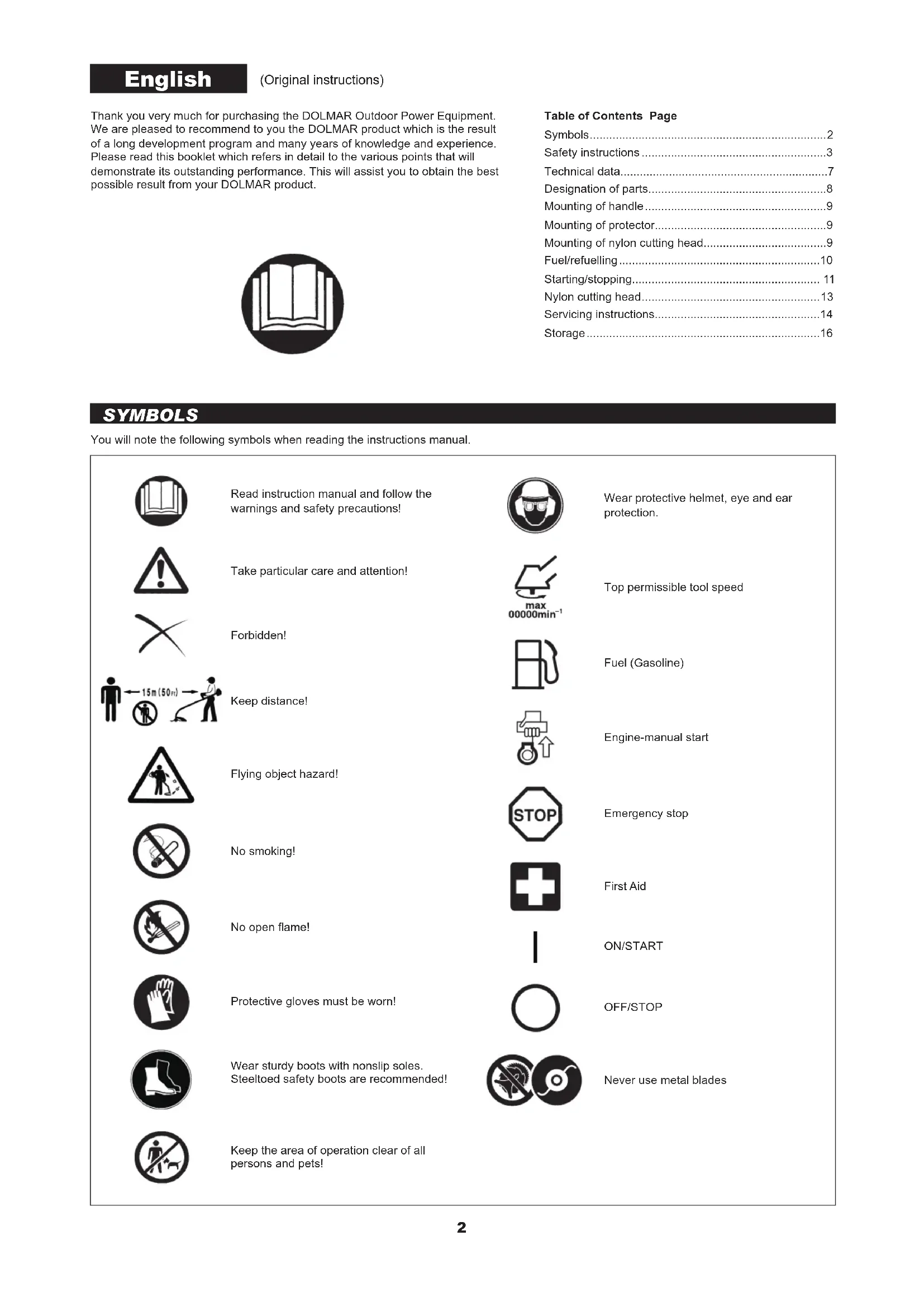 Thank you very much for purchasing the DOLMAR Outdoor Power Equipment. We are pleased to recommend to you the DOLMAR product which is the result of a long development program and many years of knowledge and experience. Please read this booklet which refers in detail to the various points that will demonstrate its outstanding performance. This will assist you to obtain the best possible result from your DOLMAR product.