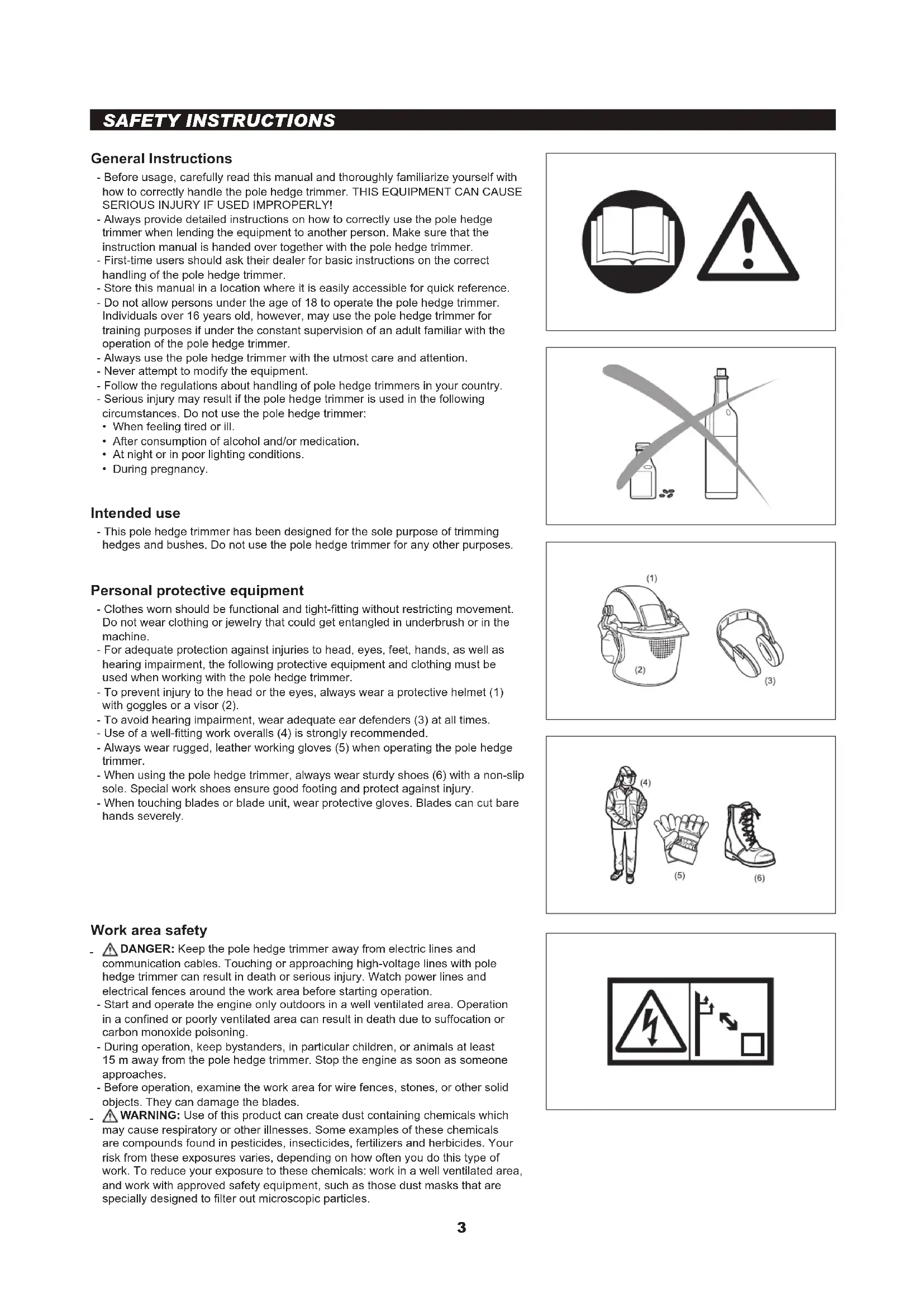 - During pregnancy. Intended use - This pole hedge trimmer has been designed for the sole purpose of trimming hedges and bushes. Do not use the pole hedge trimmer for any other purposes. Personal protective equipment - Clothes worn should be functional and tight-tting without restricting movement. Do not wear clothing or jewelry that could get entangled in underbrush or in the machine. - For adequate protection against injuries to head, eyes, feet, hands, as well as hearing impairment, the following protective equipment and clothing must be used when working with the pole hedge trimmer. - To prevent injury to the head or the eyes, always wear a protective helmet (1) with goggles or a visor (2). - To avoid hearing impairment, wear adequate ear defenders (3) at all times. - Use of a well-tting work overalls (4) is strongly recommended. - Always wear rugged, leather working gloves (5) when operating the pole hedge trimmer. - When using the pole hedge trimmer, always wear sturdy shoes (6) with a non-slip sole. Special work shoes ensure good footing and protect against injury. - When touching blades or blade unit, wear protective gloves. Blades can cut bare hands severely. Work area safety