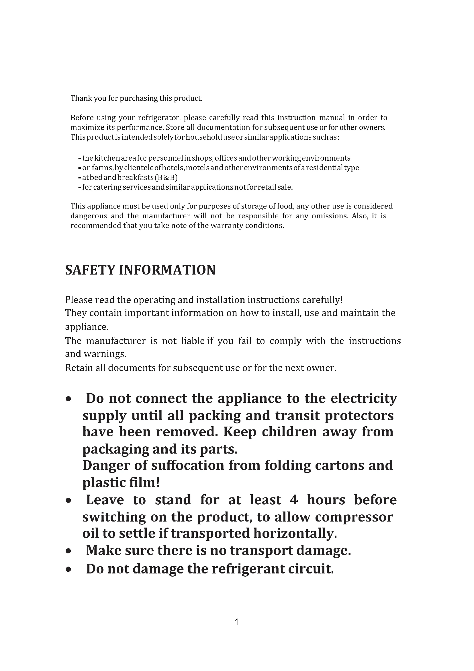 &RQWHQW 6DIHW\,QIRUPDWLRQ 3DJHa 2YHUYLHZ 3DJH ,QVWDOODWLRQ 3DJHa 8VHULQWHUIDFH 3DJHa 'DLO\8VH 3DJHaThank you for purchasing this product. Before using your refrigerator, please carefully read this instruction manual in order to maximize its performance. Store all documentation for subsequent use or for other owners. This product is intended solely for household use or similar applications such as: - t h e k i t c h e n a r e a f o r p e r s o n n e l i n s h o p s , o f f i c e s a n d o t h e r w o r k ing environments - on farms, by clientele of hotels, motels and other environments of a residential type - a t b e d a n d b r e a k f a s t s ( B & B ) - f o r c a t e r i n g s e r v i c e s a n d s i m i l a r a p p l i c a t i o n s n o t f o r r e t a i l s ale. This appliance must be used only for purposes of storage of food, any other use is considered dangerous and the manufacturer will not be responsible for any omissions. Also, it is recommended that you take note of the warranty conditions. SAFETY INFORMATION Please read the operating and installation instructions carefully! They contain important information on how to install, use and maintain the appliance. The manufacturer is not liable if you fail to comply with the instructions and warnings. Retain all documents for subsequent use or for the next owner. x Do not connect the appliance to the electricity supply until all packing and transit protectors have been removed. Keep children away from packaging and its parts. Danger of suffocation from folding cartons and plastic film! x Leave to stand for at least 4 hours before switching on the product, to allow compressor oil to settle if transported horizontally. x Make sure there is no transport damage. x Do not damage the refrigerant circuit. 1x Maintain the ventilation openings in the appliance enclosure or in the built-in structure, free of obstruction. x Never use water to wash the compressor position, wipe it with a dry cloth thoroughly after cleaning to prevent rust. x Handle the appliance always with at least two persons because it is heavy. x Install and level the appliance in an area suitable for its size and use. x Make sure that the electrical information on the rating plate agrees with the power supply. If it does not, contact an electrician. x The appliance is operated by a 220-240 VAC/50 Hz power supply. Abnormal voltage fluctuation may cause the appliance to fail to start, or damage to the temperature control or compressor, or there may be an abnormal noise when operating. In such case, an automatic regulator shall be mounted. x Only for UK: The appliance’s power cable is fitted with 3-cord (grounding) plug that fits a standard 3-cord (grounded) socket. Never cut off or dismount the third pin (grounding). After the appliance is installed, the plug should be accessible. x Make sure that mains cable is not caught under the appliance during and after 2carrying/moving the appliance, to avoid the mains cable becoming cut or damaged. If the supply cord is damaged, it must be replaced by the manufacturer, its service agent or similarly qualified person in order to avoid a hazard. x Do not install the appliance in humid, oily or dusty places, nor expose it to direct sunlight and to water. x Do not install the appliance near heaters or inflammable materials. x FOR appliances with a freezer compartment: if there is a power failure do not open the lid. Frozen food should not be affected if the failure lasts for less than the hours indicated on the rating label (Temperature rise time). If the failure is longer, then the food should be checked and eaten immediately or cooked and then refrozen. x If you find that the lid of the appliance is difficult to open just after you have closed it, don’t worry. This is due to the pressure difference which will equalize and allow the lid to be opened normally after a few minutes. x Do not store medicines, bacteria or chemical agents in the appliance. This appliance is a household appliance, it is not recommended to store materials that require strict temperatures. x Do not excessively pull or fold the power cord 3or touch the plug with wet hands. x Do not store products which contain flammable propellant (e.g. spray cans) or explosive substances in the appliance. Risk of explosion! x Do not place unstable articles (heavy objects, containers filled with water) on top of the refrigerator, to ovoid personal injury caused by falling or electric shock caused by contact with water. x Do not use electrical appliances inside the food storage compartments, unless they are of the type recommended by the manufacturer. x Do not touch internal cooling elements, especially with wet hands, to avoid cracks or injuries. x At risk here are children, people who have limited physical, mental or sensory abilities, as well as people who have inadequate knowledge concerning safe operation of the appliance. x Check that children and vulnerable people have understood the hazards. A person responsible for safety must supervise or instruct children and vulnerable people who are using the appliance. Only children aged 8 years and above may use the appliance. x Children should not play with the appliance. 4x Children aged from 3 to 8 years are allowed to load and unload this appliance. x FOR appliances with a freezer compartment: do not store bottled or canned liquids (especially carbonated drinks) in the freezer compartment. Bottles and cans may burst! x FOR appliances with a freezer compartment: never put frozen food straight from the freezer compartment in your mouth. Risk of low- temperature burns! x Keep plastic parts and the door seal free of oil and grease. Otherwise, plastic parts and the door seal will become porous. x Before performing any operation, unplug the power cord from the power socket. x Do not use mechanical devices or other means to accelerate the defrosting process, other than those recommended by the manufacturer. x Do not use pointed or s