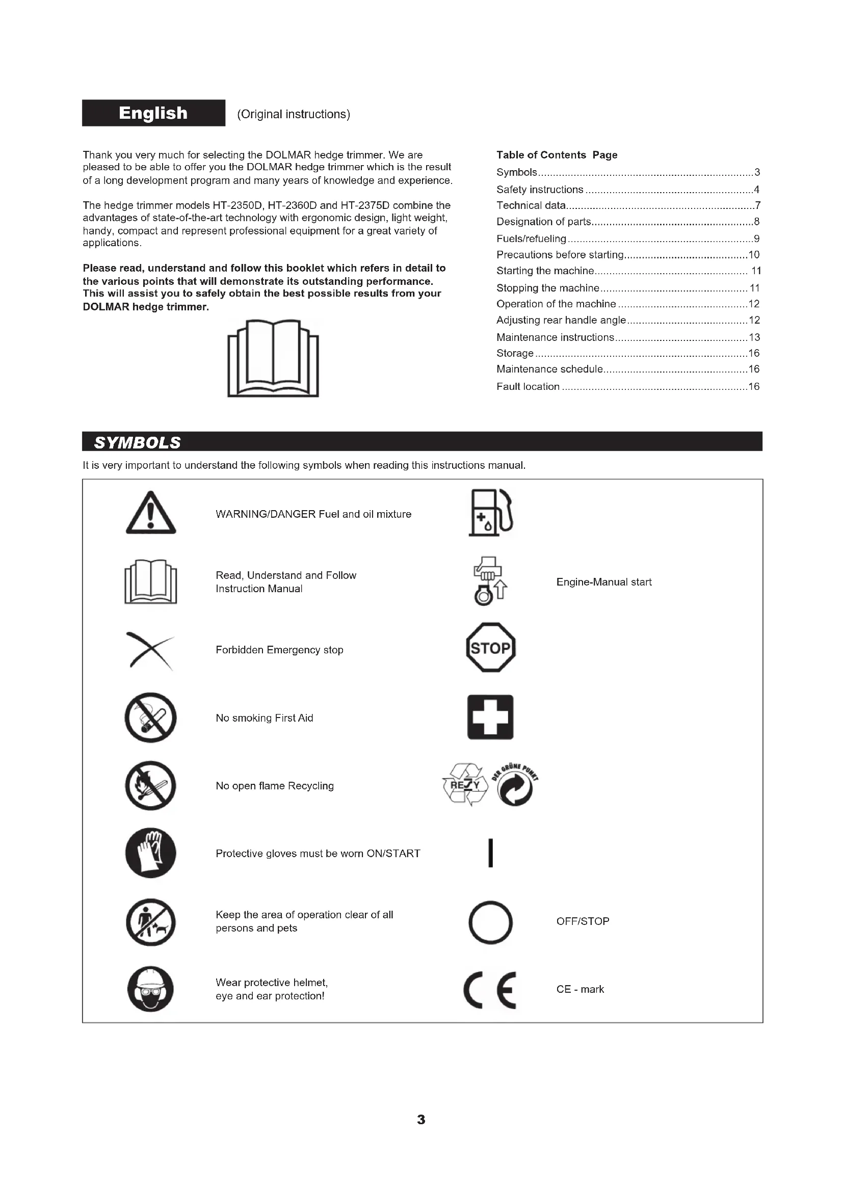 - Pour réduire les RISQUES de blessure, l’utilisateur est tenu de lire et comprendre le manuel d’instruction avant d’utiliser le taille-haie. Le fabricant se réserve le droit de modier les spécications sans préavis. Les spécications peuvent varier d’un pays à l’autre. Si vous prêtez le taille-haie, veillez à l’accompagner de ce manuel. WARNUNG: Um die GEFAHR von Verletzungen zu vermeiden, muss der Benutzer vor der Benutzung der Heckenschere diese Bedienungsanleitung sorgfältig lesen. Der Hersteller behält sich das Recht vor, ohne Vorankündigung Änderungen an denTechnischen Daten vorzunehmen. Die Technischen Daten können in den einzelnen Ländern voneinander abweichen. Händigen Sie mit der Übergabe der Heckenschere an andere Personen unbedingt auch diese Bedienungsanleitung aus. AVVERTENZA: Per ridurre il RISCHIO di incidenti, è necessario aver letto e compreso il manuale di istruzioni prima di iniziare a utilizzare il tagliasiepi. Il produttore si riserva il diritto di apportare modiche alle caratteristiche tecniche senza preavviso. Le caratteristiche tecniche variano a seconda del Paese. Quando si dà in prestito il tagliasiepi, consegnare sempre anche il presente manuale. WAARSCHUWING: Om het RISICO van letsel te verkleinen, moet de gebruiker de gebruiksaanwijzing lezen en begrijpen voordat hij/zij de heggenschaar gebruikt. De fabrikant behoudt zich het recht voor zonder kennisgeving de technische gegevens te veranderen. De technische gegevens kunnen van land tot land verschillen. Geef de heggenschaar alleen aan een ander tezamen met deze gebruiksaanwijzing. ADVERTENCIA: Para reducir el RIESGO de lesiones, el usuario debe leer y comprender el manual de instrucciones antes de utilizar el corta setos. El fabricante se reserva el derecho de cambiar las especicaciones sin previo aviso. Las especicaciones pueden diferir de un país a otro. El corta setos sólo se debe entregar a otra persona con este manual. AVISO: Para reduzir o RISCO de ferimentos, o utilizador tem de ler e compreender o manual de instruções antes de utilizar o aparador de sebes. O fabricante reserva-se o direito de alterar as especicações sem aviso prévio. As especicações podem variar de país para país. Entregue sempre o aparador de sebes juntamente com este manual. ADVARSEL: For at reducere RISIKOEN for tilskadekomst skal brugeren læse og forstå brugsanvisningen inden brug af hækkeklipperen. Producenten forbeholder sig ret til at ændre specikationer uden varsel. Specikationerne kan variere fra land til land. Overdrag kun hækkeklipperen sammen med denne brugsanvisning. ΠΡΟΕΙΔΟΠΟΙΗΣΗ: Για την ελάττωση του ΚΙΝΔΥΝΟΥ του τραυματισμού, ο χρήστης πρέπει να διαβάσει και να κατανοήσει το εγχειρίδιο οδηγιών πριν προβεί στη χρήση του ψαλιδιού μπορντούρας. Ο κατασκευαστής διατηρεί το δικαίωμα να αλλάξει τα τεχνικά χαρακτηριστικά χωρίς προειδοποίηση. Τα τεχνικά χαρακτηριστικά ενδέχεται να διαφέρουν ανάλογα με τη χώρα. Να παραδίδετε πάντοτε το ψαλίδι μπορντούρας μαζί με αυτό το εγχειρίδιο.3 Thank you very much for selecting the DOLMAR hedge trimmer. We are pleased to be able to offer you the DOLMAR hedge trimmer which is the result of a long development program and many years of knowledge and experience. The hedge trimmer models HT-2350D, HT-2360D and HT-2375D combine the advantages of state-of-the-art technology with ergonomic design, light weight, handy, compact and represent professional equipment for a great variety of applications. Please read, understand and follow this booklet which refers in detail to the various points that will demonstrate its outstanding performance. This will assist you to safely obtain the best possible results from your DOLMAR hedge trimmer. It is very important to understand the following symbols when reading this instructions manual. SYMBOLS English WARNING/DANGER Fuel and oil mixture Read, Understand and Follow Instruction Manual Engine-Manual start Forbidden Emergency stop No smoking First Aid No open ame Recycling Protective gloves must be worn ON/START Keep the area of operation clear of all persons and pets OFF/STOP Wear protective helmet, eye and ear protection! CE - mark (Original instructions) Table of Contents Page Symbols p. 3