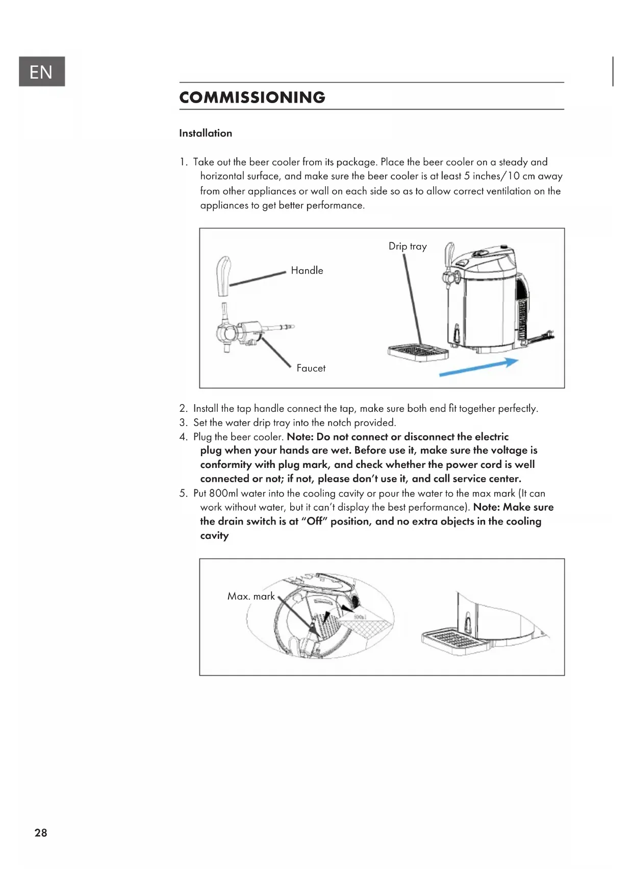 work without water, but it can’t display the best performance). Note: Make sure the drain switch is at “Off” position, and no extra objects in the cooling cavity Handle Drip tray Faucet Max. mark29