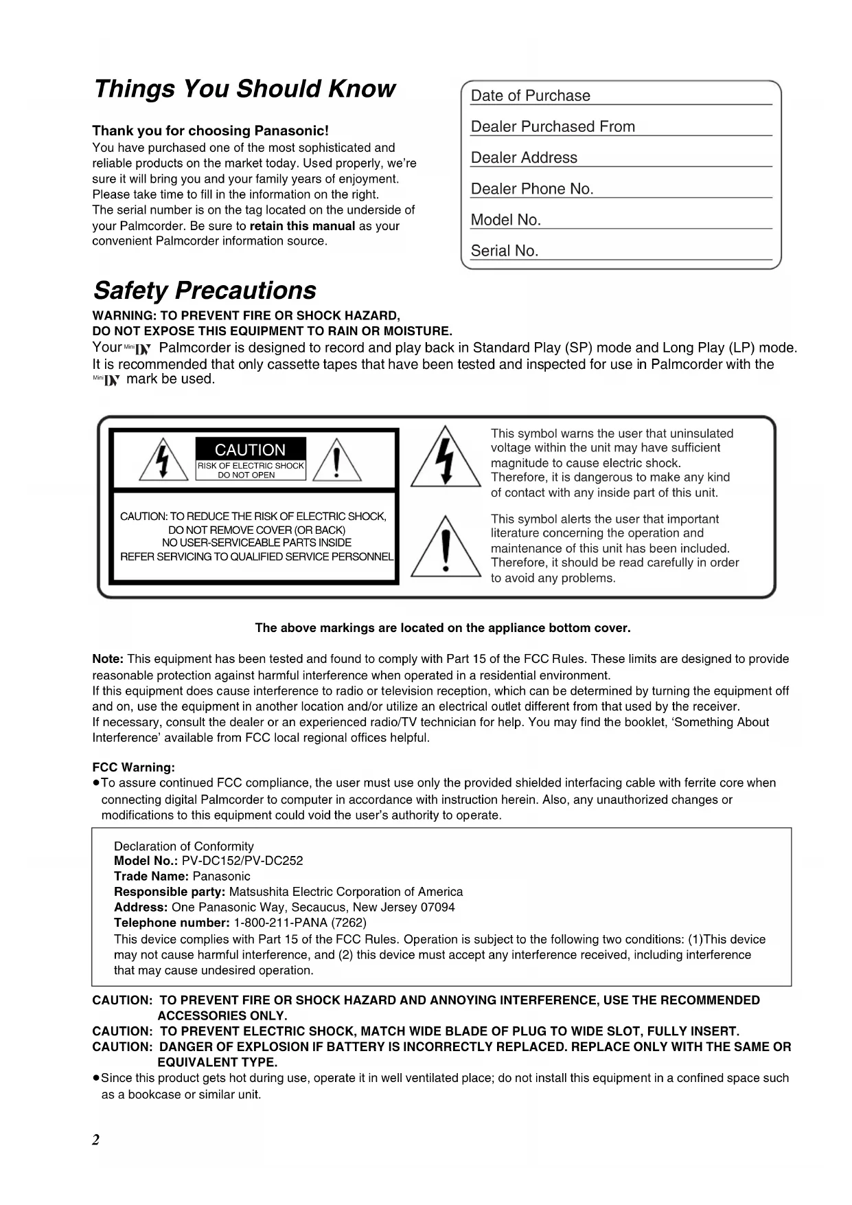 Your Palmcorder is designed to record and play back in Standard Play (SP) mode and Long Play (LP) mode. It is recommended that only cassette tapes that have been tested and inspected for use in Palmcorder with the mark be used. The above markings are located on the appliance bottom cover. Note: This equipment has been tested and found to comply with Part 15 of the FCC Rules. These limits are designed to provide reasonable protection against harmful interference when operated in a residential environment. If this equipment does cause interference to radio or television reception, which can be determined by turning the equipment off and on, use the equipment in another location and/or utilize an electrical outlet different from that used by the receiver. If necessary, consult the dealer or an experienced radio/TV technician for help. You may find the booklet, ‘Something About Interference’ available from FCC local regional offices helpful. FCC Warning: ≥To assure continued FCC compliance, the user must use only the provided shielded interfacing cable with ferrite core when connecting digital Palmcorder to computer in accordance with instruction herein. Also, any unauthorized changes or modifications to this equipment could void the user’s authority to operate. Declaration of ConformityModel No.: PV-DC152/PV-DC252Trade Name: PanasonicResponsible party: Matsushita Electric Corporation of AmericaAddress: One Panasonic Way, Secaucus, New Jersey 07094Telephone number: 1-800-211-PANA (7262) This device complies with Part 15 of the FCC Rules. Operation is subject to the following two conditions: (1)This device may not cause harmful interference, and (2) this device must accept any interference received, including interference that may cause undesired operation.CAUTION: TO PREVENT FIRE OR SHOCK HAZARD AND ANNOYING INTERFERENCE, USE THE RECOMMENDED ACCESSORIES ONLY.CAUTION: TO PREVENT ELECTRIC SHOCK, MATCH WIDE BLADE OF PLUG TO WIDE SLOT, FULLY INSERT.CAUTION: DANGER OF EXPLOSION IF BATTERY IS INCORRECTLY REPLACED. REPLACE ONLY WITH THE SAME OR EQUIVALENT TYPE. ≥Since this product gets hot during use, operate it in well ventilated place; do not install this equipment in a confined space such as a bookcase or similar unit.