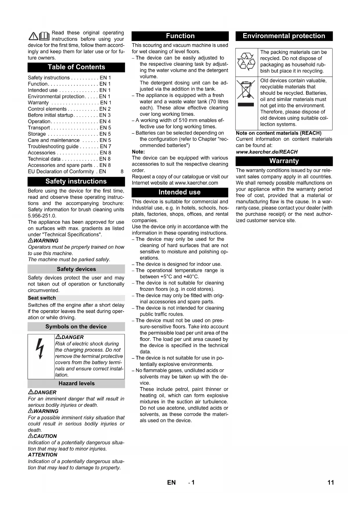 Chairman of the Board of Management Director Regulatory Affairs & Certification 10 DE- 1 Read these original operating instructions before using your device for the first time, follow them accord- ingly and keep them for later use or for fu- ture owners. Before using the device for the first time, read and observe these operating instruc- tions and the accompanying brochure: Safety information for brush cleaning units 5.956-251.0. The appliance has been approved for use on surfaces with max. gradients as listed under "Technical Specifications". 몇 WARNING Operators must be properly trained on how to use this machine. The machine must be parked safely. Safety devices protect the user and may not taken out of operation or functionally circumvented. Switches off the engine after a short delay if the operator leaves the seat during oper- ation or while driving. DANGER For an imminent danger that will result in serious bodily injuries or death. 몇 WARNING For a possible imminent risky situation that could result in serious bodily injuries or death. 몇 CAUTION Indication of a potentially dangerous situa- tion that may lead to minor injuries. ATTENTION Indication of a potentially dangerous situa- tion that may lead to damage to property. This scouring and vacuum machine is used for wet cleaning of level floors. – The device can be easily adjusted to the respective cleaning task by adjust- ing the water volume and the detergent volume. The detergent dosing unit can be ad- justed via the addition in the tank. – The appliance is equipped with a fresh water and a waste water tank (70 litres each). These allow effective cleaning over long working times. – A working width of 510 mm enables ef- fective use for long working times. – Batteries can be selected depending on the configuration (refer to Chapter "rec- ommended batteries") Note: The device can be equipped with various accessories to suit the respective cleaning order. Request a copy of our catalogue or visit our Internet website at www.kaercher.com This device is suitable for commercial and industrial use, e.g. in hotels, schools, hos- pitals, factories, shops, offices, and rental companies. Use the device only in accordance with the information in these operating instructions. – The device may only be used for the cleaning of hard surfaces that are not sensitive to moisture and polishing op- erations. – The device is designed for indoor use.– The operational temperature range is between +5°C and +40°C. – The device is not suitable for cleaning frozen floors (e.g. in cold stores). – The device may only be fitted with orig- inal accessories and spare parts. – The device is not intended for cleaning public traffic routes. – The device must not be used on pres- sure-sensitive floors. Take into account the permissible load per unit area of the floor. The load per unit area caused by the device is specified in the technical data. – The device is not suitable for use in po- tentially explosive environments. – No flammable gases, undiluted acids or solvents may be taken up with the de- vice. These include petrol, paint thinner or heating oil, which can form explosive mixtures in the suction air turbulence. Do not use acetone, undiluted acids or solvents, as these corrode the materi- als used on the device. Note on content materials (REACH) Current information on content materials can be found at: www.kaercher.de/REACH The warranty conditions issued by our rele- vant sales company apply in all countries. We shall remedy possible malfunctions on your appliance within the warranty period free of cost, provided that a material or manufacturing flaw is the cause. In a war- ranty case, please contact your dealer (with the purchase receipt) or the next author- ized customer service site. Table of Contents Safety instructions ... EN 1 Function... EN 1 Intended use ... EN 1 Environmental protection... EN 1 Warranty ... EN 1 Control elements ... EN 2 Before initial startup... EN 3 Operation... EN 4 Transport ... EN 5 Storage ... EN 5 Care and maintenance ... EN 5 Troubleshooting guide ... EN 7 Accessories ... EN 8 Technical data ... EN 8 Accessories and spare parts ... EN 8 EU Declaration of Conformity . EN 8 Safety instructions Safety devices Seat switch Symbols on the device DANGER Risk of electric shock during the charging process. Do not remove the terminal protective covers from the battery termi- nals and ensure correct instal- lation. Hazard levels Function Intended use Environmental protection The packing materials can be recycled. Do not dispose of packaging as household rub- bish but place it in recycling. Old devices contain valuable, recyclable materials that should be recycled. Batteries, oil and similar materials must not get into the environment. Therefore, please dispose of old devices using suitable col- lection systems. Warranty 11EN- 2 1Seat 2 Waste water tank cap 3 Dosing equipment for dirt water 4 Steering wheel 5 Horn push button 6 Driving direction switch 7 Working speed rotary knob 8 Key-operated switch 9 Display 10 Suction bar lever 11 Water volume regulation knob 12 Accelerator pedal 13 Brush replacement pedal 14 Disc brush 15 Cleaning head 16 Fresh water filling level indicator 17 Suction bar * 18 Waste water tank 19 Waste water drain hose 20 Twist grip to incline the suction bar 21 Wing nuts for fastening the suction bar 22 Suction hose 23 Fresh water tank cap with fresh water filter 24 Raising/lowering the pedal for the cleaning head 25 Lid of fresh water tank Filling hole for fresh water 26 Battery plug connector 27 Steering wheel height adjustment