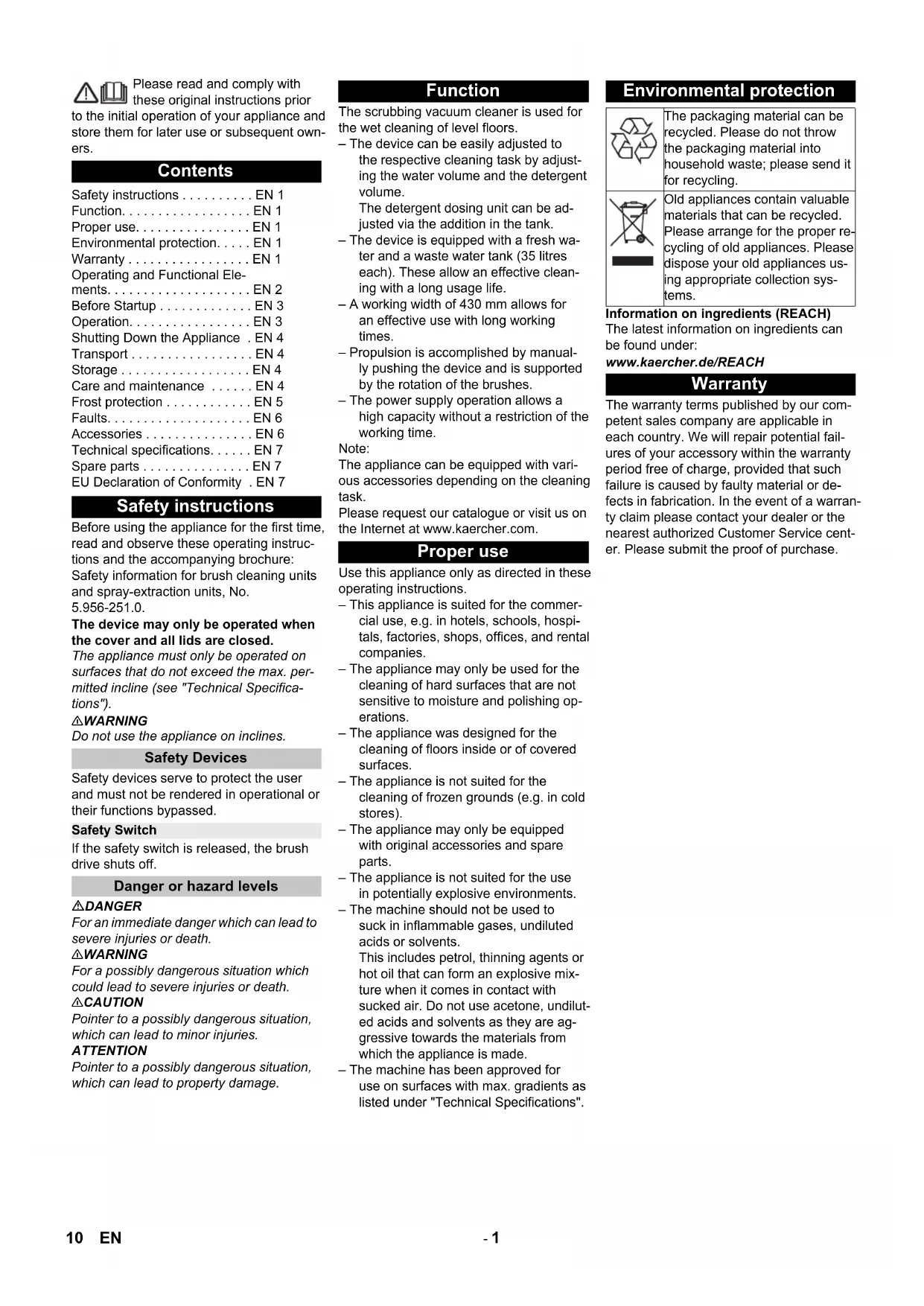 Chairman of the Board of Management Director Regulatory Affairs & Certification 9DE- 1 Please read and comply with these original instructions prior to the initial operation of your appliance and store them for later use or subsequent own- ers. Before using the appliance for the first time, read and observe these operating instruc- tions and the accompanying brochure: Safety information for brush cleaning units and spray-extraction units, No. 5.956-251.0. The device may only be operated when the cover and all lids are closed. The appliance must only be operated on surfaces that do not exceed the max. per- mitted incline (see "Technical Specifica- tions"). 몇 WARNING Do not use the appliance on inclines. Safety devices serve to protect the user and must not be rendered in operational or their functions bypassed. If the safety switch is released, the brush drive shuts off. DANGER For an immediate danger which can lead to severe injuries or death. 몇 WARNING For a possibly dangerous situation which could lead to severe injuries or death. 몇 CAUTION Pointer to a possibly dangerous situation, which can lead to minor injuries. ATTENTION Pointer to a possibly dangerous situation, which can lead to property damage. The scrubbing vacuum cleaner is used for the wet cleaning of level floors. – The device can be easily adjusted to the respective cleaning task by adjust- ing the water volume and the detergent volume. The detergent dosing unit can be ad- justed via the addition in the tank. – The device is equipped with a fresh wa- ter and a waste water tank (35 litres each). These allow an effective clean- ing with a long usage life. – A working width of 430 mm allows for an effective use with long working times. – Propulsion is accomplished by manual- ly pushing the device and is supported by the rotation of the brushes. – The power supply operation allows a high capacity without a restriction of the working time. Note: The appliance can be equipped with vari- ous accessories depending on the cleaning task. Please request our catalogue or visit us on the Internet at www.kaercher.com. Use this appliance only as directed in these operating instructions. – This appliance is suited for the commer- cial use, e.g. in hotels, schools, hospi- tals, factories, shops, offices, and rental companies. – The appliance may only be used for the cleaning of hard surfaces that are not sensitive to moisture and polishing op- erations. – The appliance was designed for the cleaning of floors inside or of covered surfaces. – The appliance is not suited for the cleaning of frozen grounds (e.g. in cold stores). – The appliance may only be equipped with original accessories and spare parts. – The appliance is not suited for the use in potentially explosive environments. – The machine should not be used to suck in inflammable gases, undiluted acids or solvents. This includes petrol, thinning agents or hot oil that can form an explosive mix- ture when it comes in contact with sucked air. Do not use acetone, undilut- ed acids and solvents as they are ag- gressive towards the materials from which the appliance is made. – The machine has been approved for use on surfaces with max. gradients as listed under "Technical Specifications". Information on ingredients (REACH) The latest information on ingredients can be found under: www.kaercher.de/REACH The warranty terms published by our com- petent sales company are applicable in each country. We will repair potential fail- ures of your accessory within the warranty period free of charge, provided that such failure is caused by faulty material or de- fects in fabrication. In the event of a warran- ty claim please contact your dealer or the nearest authorized Customer Service cent- er. Please submit the proof of purchase. Contents Safety instructions ... EN 1 Function... EN 1 Proper use... EN 1 Environmental protection... EN 1 Warranty ... EN 1 Operating and Functional Ele- ments... EN 2 Before Startup ... EN 3 Operation... EN 3 Shutting Down the Appliance . EN 4 Transport ... EN 4 Storage ... EN 4 Care and maintenance ... EN 4 Frost protection ... EN 5 Faults... EN 6 Accessories ... EN 6 Technical specifications... EN 7 Spare parts ... EN 7 EU Declaration of Conformity . EN 7 Safety instructions Safety Devices Safety Switch Danger or hazard levels Function Proper use Environmental protection The packaging material can be recycled. Please do not throw the packaging material into household waste; please send it for recycling. Old appliances contain valuable materials that can be recycled. Please arrange for the proper re- cycling of old appliances. Please dispose your old appliances us- ing appropriate collection sys- tems. Warranty 10 EN- 2 1 Fluff filter 2 Safety button 3 Drain hose for wastewater with dosing unit 4 Holding rail for home base 5 Float 6 Fresh water tank 7 Fresh water tank lock 8 Recessed grip 9 Cleaning head 10 Disc brush 11 Fresh water reservoir filler neck 12 Bow brush change 13 Waste water tank 14 Fresh water level display 15 Rotary handle to incline the vacuum bar 16 Height adjustment of suction bar * 17 Wing nuts for fastening the vacuum bar 18 Vacuum bar * 19 Suction hose 20 Water quantity regulator 21 Mains cable with mains plug 22 Vacuum bar lowering lever 23 Operator console 24 Push handle 25 Storage surface for cleaning set "Home base box“ 26 Cover waste water tank