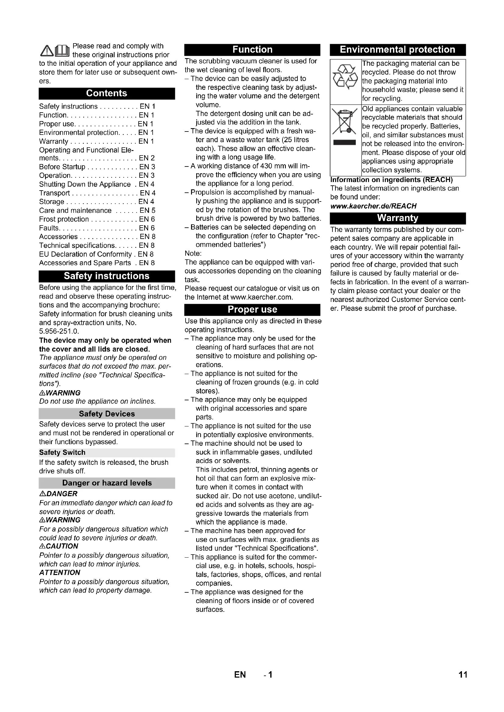 Zubehör und Ersatzteile Chairman of the Board of Management Director Regulatory Affairs & Certification 10 DE- 1 Please read and comply with these original instructions prior to the initial operation of your appliance and store them for later use or subsequent own- ers. Before using the appliance for the first time, read and observe these operating instruc- tions and the accompanying brochure: Safety information for brush cleaning units and spray-extraction units, No. 5.956-251.0. The device may only be operated when the cover and all lids are closed. The appliance must only be operated on surfaces that do not exceed the max. per- mitted incline (see "Technical Specifica- tions"). 몇 WARNING Do not use the appliance on inclines. Safety devices serve to protect the user and must not be rendered in operational or their functions bypassed. If the safety switch is released, the brush drive shuts off. DANGER For an immediate danger which can lead to severe injuries or death. 몇 WARNING For a possibly dangerous situation which could lead to severe injuries or death. 몇 CAUTION Pointer to a possibly dangerous situation, which can lead to minor injuries. ATTENTION Pointer to a possibly dangerous situation, which can lead to property damage. The scrubbing vacuum cleaner is used for the wet cleaning of level floors. – The device can be easily adjusted to the respective cleaning task by adjust- ing the water volume and the detergent volume. The detergent dosing unit can be ad- justed via the addition in the tank. – The device is equipped with a fresh wa- ter and a waste water tank (25 litres each). These allow an effective clean- ing with a long usage life. – A working distance of 430 mm will im- prove the efficiency when you are using the appliance for a long period. – Propulsion is accomplished by manual- ly pushing the appliance and is support- ed by the rotation of the brushes. The brush drive is powered by two batteries. – Batteries can be selected depending on the configuration (refer to Chapter "rec- ommended batteries") Note: The appliance can be equipped with vari- ous accessories depending on the cleaning task. Please request our catalogue or visit us on the Internet at www.kaercher.com. Use this appliance only as directed in these operating instructions. – The appliance may only be used for the cleaning of hard surfaces that are not sensitive to moisture and polishing op- erations. – The appliance is not suited for the cleaning of frozen grounds (e.g. in cold stores). – The appliance may only be equipped with original accessories and spare parts. – The appliance is not suited for the use in potentially explosive environments. – The machine should not be used to suck in inflammable gases, undiluted acids or solvents. This includes petrol, thinning agents or hot oil that can form an explosive mix- ture when it comes in contact with sucked air. Do not use acetone, undilut- ed acids and solvents as they are ag- gressive towards the materials from which the appliance is made. – The machine has been approved for use on surfaces with max. gradients as listed under "Technical Specifications". – This appliance is suited for the commer- cial use, e.g. in hotels, schools, hospi- tals, factories, shops, offices, and rental companies. – The appliance was designed for the cleaning of floors inside or of covered surfaces. Information on ingredients (REACH) The latest information on ingredients can be found under: www.kaercher.de/REACH The warranty terms published by our com- petent sales company are applicable in each country. We will repair potential fail- ures of your accessory within the warranty period free of charge, provided that such failure is caused by faulty material or de- fects in fabrication. In the event of a warran- ty claim please contact your dealer or the nearest authorized Customer Service cent- er. Please submit the proof of purchase. Contents Safety instructions ... EN 1 Function... EN 1 Proper use... EN 1 Environmental protection... EN 1 Warranty ... EN 1 Operating and Functional Ele- ments... EN 2 Before Startup ... EN 3 Operation... EN 3 Shutting Down the Appliance . EN 4 Transport ... EN 4 Storage ... EN 4 Care and maintenance ... EN 5 Frost protection ... EN 6 Faults... EN 6 Accessories ... EN 8 Technical specifications... EN 8 EU Declaration of Conformity . EN 8 Accessories and Spare Parts . EN 8 Safety instructions Safety Devices Safety Switch Danger or hazard levels Function Proper use Environmental protection The packaging material can be recycled. Please do not throw the packaging material into household waste; please send it for recycling. Old appliances contain valuable recyclable materials that should be recycled properly. Batteries, oil, and similar substances must not be released into the environ- ment. Please dispose of your old appliances using appropriate collection systems. Warranty 11EN- 2 1 Fluff filter 2 Safety button 3 Battery * 4 Drain hose for wastewater with dosing unit 5 Holding rail for home base 6 Float 7 Fresh water tank 8 Fresh water tank lock 9 Cleaning head 10 Disc brush 11 Fresh water reservoir filler neck 12 Bow brush change 13 Waste water tank 14 Pedal transport chassis 15 Fresh water level display 16 Rotary handle to incline the vacuum bar 17 Height adjustment of suction bar * 18 Wing nuts for fastening the vacuum bar 19 Vacuum bar * 20 Suction hose 21 Water quantity regulator 22 Battery socket 23 Vacuum bar lowering lever 24 Operator console 25 Push handle 26 Storage surface for cleaning set "Home base box“ 27 Cover waste water tank