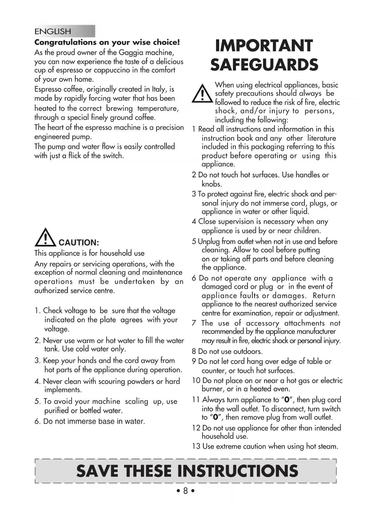 7 Spoon the froth onto the espresso in each cup and gently pour the hot milk along the side of the cup. Top each cup of cappucci- no with a dash of cinnamon, cocoa and nutmeg. Serve. 8 NOTE: If you want to make more espresso immediately after steaming milk, the machine boiler must be refilled with water and temperature brought down to a brewing temperature. Otherwise, espresso may taste burned. To do this: place an empty cup on drip plate. Do not insert filter holder. Turn hot water/ brew switch (4) to 1 letting cup fill with water. Turn brew switch 0. You many now proceed to make more espresso. 5 Slowly turn steam valve knob (7) counter clockwise and turn the hot water/brew switch to 1 to release hot water. N.B.: Dispensing should not exceed 60 seconds. 6 When you have prepared the desired quantity of hot water, turn steam knob clockwise and hot water/brew switch to 0 to shut off hot water and remove pitcher. 7 NOTE: If you want to make espresso immediately after making hot water, the tem- perature of the machine boiler must be brought down to a brewing temperature. Otherwise, espresso may taste burned. To do this: place an empty cup on drip plate. Do not insert filter holder. Turn hot water/ brew switch (2) to 1 letting cup fill with water. Turn brew switch 0. You may now proceed to make espresso. Keeping it clean: 1 IMPORTANT: the steam nozzle should be cleaned after each use in order to avoid build up of milk deposits that are very difficult to clean. The outside of the steam pipe can be cleaned with a damp cloth. The steam jet is cleaned by running a shot of steam through it. The hole in the steam nozzle must be kept open. A needle may be used. 2 Clean filter holder and filter in warm water after use. 12 ENGLISH Descaling: In hard water areas, minerals found in the water will accumulate and affect operation of the unit. Approximately every two months (this can vary depending on use and water condition), clean the machine with Gaggia descaler (in which case follow the instructions on the packet). Remove shower disc (16) and clean. Pour solution into tank and turn on pump for 15 seconds. Allow solution to flow through brewing head and steam nozzle for several seconds. Wait 20 minutes, then repeat. process until solution has been run through. Rinse machine thoroughly by running plain cold water through machine. Replace shower disc (16). NOTE: Product failure due to scale accumulation is not covered by warranty. No other servicing should be attempted by the user. Use Gaggia cleaner for best results. 3 Wipe body of machine with a damp cloth as required. 4 Remove drip tray and plate (5-12) and wash in warm soapy water. Do not use abrasive substances. 5 Clean the seal (15) inside of the brewing head (14) and keep it clean. 6 The shower disc (16) should be unscrewed and cleaned periodically depending on frequency of use. 7 After long periods of non-use, drain stale water from machine by turning hot water/ coffee switch to 1. However, do this only after you have filled tank with fresh water. Never operate pump unless there is water in tank. 8 NOTE: It is very normal for an espresso machine to emit steam and drip occasionally as the water pressure changes during use. Be certain to empty drip tray (12) as required,