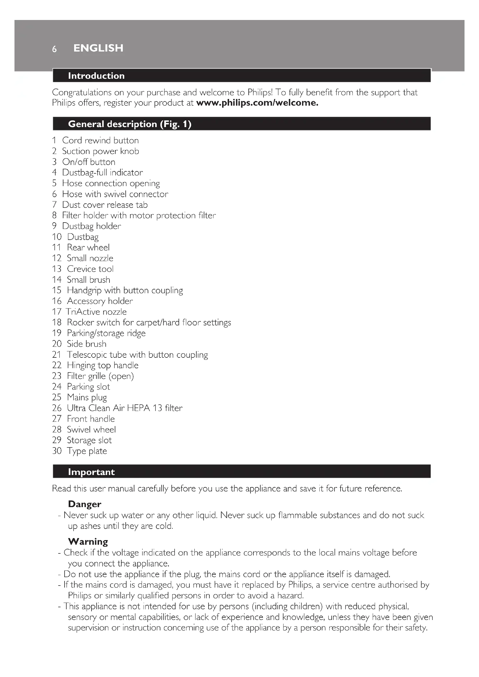 Register your product and get support at www.philips.com/welcome FC9150-FC91591FC9150-FC9159 English 6 Dansk 12 DEutsCh 18 Ελληνικα 24 Español 31 suomi 37 Français 43 italiano 49 nEDErlanDs 55 norsk 61 português 67 svEnska 73 türkçE 796 Introduction Congratulations on your purchase and welcome to Philips! To fully benet from the support that Philips offers, register your product at www.philips.com/welcome. General description (Fig. 1) 1 Cord rewind button 2 Suction power knob 3 On/off button 4 Dustbag-full indicator 5 Hose connection opening 6 Hose with swivel connector 7 Dust cover release tab 8 Filter holder with motor protection lter 9 Dustbag holder 10 Dustbag 11 Rear wheel 12 Small nozzle 13 Crevice tool 14 Small brush 15 Handgrip with button coupling 16 Accessory holder 17 TriActive nozzle 18 Rocker switch for carpet/hard oor settings 19 Parking/storage ridge 20 Side brush 21 Telescopic tube with button coupling 22 Hinging top handle 23 Filter grille (open) 24 Parking slot 25 Mains plug 26 Ultra Clean Air HEPA 13 lter 27 Front handle 28 Swivel wheel 29 Storage slot 30 Type plate Important Read this user manual carefully before you use the appliance and save it for future reference. Danger - Never suck up water or any other liquid. Never suck up ammable substances and do not suck up ashes until they are cold. Warning - Check if the voltage indicated on the appliance corresponds to the local mains voltage before you connect the appliance. - Do not use the appliance if the plug, the mains cord or the appliance itself is damaged. - If the mains cord is damaged, you must have it replaced by Philips, a service centre authorised by Philips or similarly qualied persons in order to avoid a hazard. - This appliance is not intended for use by persons (including children) with reduced physical, sensory or mental capabilities, or lack of experience and knowledge, unless they have been given supervision or instruction concerning use of the appliance by a person responsible for their safety. ENGLISH- Children should be supervised to ensure that they do not play with the appliance. - The plug must be removed from the socket-outlet before you clean or maintain the appliance. - Do not point the hose, the tube or any other accessory at the eyes or ears nor put it in your mouth when it is connected to the vacuum cleaner and the vacuum cleaner is switched on. Caution - When you use the vacuum cleaner to vacuum ashes, ne sand, lime, cement dust and similar substances, the pores of the dustbag become clogged. As a result, the dustbag-full indicator will indicate that the dustbag is full. Replace the dustbag, even if it is not full yet (see chapter ‘Replacing the dustbag’). - Never use the appliance without the motor protection lter. This could damage the motor and shorten the life of the appliance. - Only use Philips s-bag
