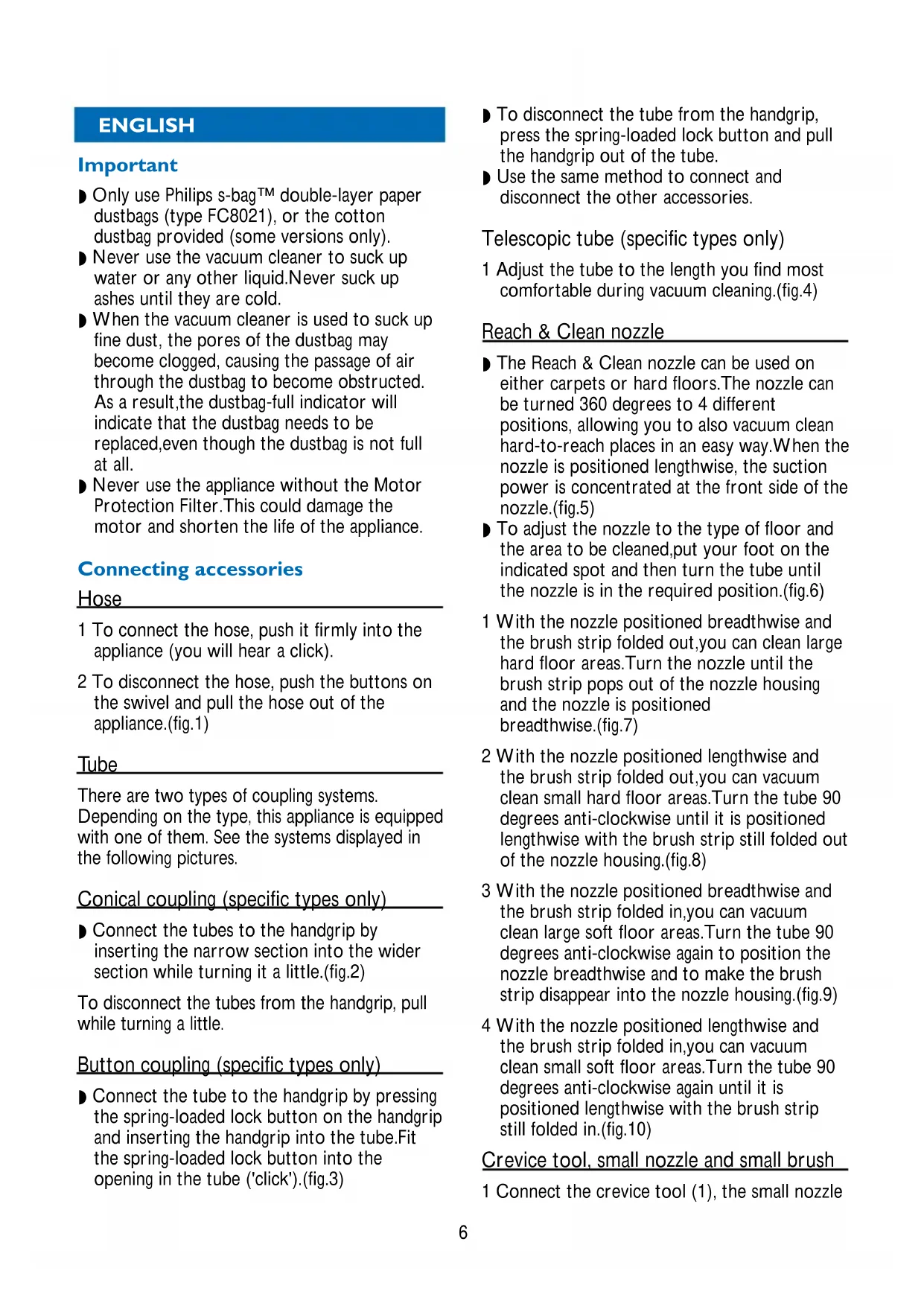 SPECIALISTImportant ◗ Only use Philips s-bag™ double-layer paper dustbags (type FC8021), or the cotton dustbag provided (some versions only). ◗ Never use the vacuum cleaner to suck up water or any other liquid.Never suck up ashes until they are cold. ◗ When the vacuum cleaner is used to suck up fine dust, the pores of the dustbag may become clogged, causing the passage of air through the dustbag to become obstructed. As a result,the dustbag-full indicator will indicate that the dustbag needs to be replaced,even though the dustbag is not full at all. ◗ Never use the appliance without the Motor Protection Filter.This could damage the motor and shorten the life of the appliance. Connecting accessories Hose 1 To connect the hose, push it firmly into the appliance (you will hear a click). 2 To disconnect the hose, push the buttons on the swivel and pull the hose out of the appliance.(fig.1) Tube There are two types of coupling systems. Depending on the type, this appliance is equipped with one of them. See the systems displayed in the following pictures. Conical coupling (specific types only) ◗ Connect the tubes to the handgrip by inserting the narrow section into the wider section while turning it a little.(fig.2) To disconnect the tubes from the handgrip, pull while turning a little. Button coupling (specific types only) ◗ Connect the tube to the handgrip by pressing the spring-loaded lock button on the handgrip and inserting the handgrip into the tube.Fit the spring-loaded lock button into the opening in the tube ('click').(fig.3) ◗ To disconnect the tube from the handgrip, press the spring-loaded lock button and pull the handgrip out of the tube. ◗ Use the same method to connect and disconnect the other accessories. Telescopic tube (specific types only) 1 Adjust the tube to the length you find most comfortable during vacuum cleaning.(fig.4) Reach & Clean nozzle ◗ The Reach & Clean nozzle can be used on either carpets or hard floors.The nozzle can be turned 360 degrees to 4 different positions, allowing you to also vacuum clean hard-to-reach places in an easy way.When the nozzle is positioned lengthwise, the suction power is concentrated at the front side of the nozzle.(fig.5) ◗ To adjust the nozzle to the type of floor and the area to be cleaned,put your foot on the indicated spot and then turn the tube until the nozzle is in the required position.(fig.6) 1 With the nozzle positioned breadthwise and the brush strip folded out,you can clean large hard floor areas.Turn the nozzle until the brush strip pops out of the nozzle housing and the nozzle is positioned breadthwise.(fig.7) 2 With the nozzle positioned lengthwise and the brush strip folded out,you can vacuum clean small hard floor areas.Turn the tube 90 degrees anti-clockwise until it is positioned lengthwise with the brush strip still folded out of the nozzle housing.(fig.8) 3 With the nozzle positioned breadthwise and the brush strip folded in,you can vacuum clean large soft floor areas.Turn the tube 90 degrees anti-clockwise again to position the nozzle breadthwise and to make the brush strip disappear into the nozzle housing.(fig.9) 4 With the nozzle positioned lengthwise and the brush strip folded in,you can vacuum clean small soft floor areas.Turn the tube 90 degrees anti-clockwise again until it is positioned lengthwise with the brush strip still folded in.(fig.10) Crevice tool, small nozzle and small brush 1 Connect the crevice tool (1), the small nozzle ENGLISH 6(2) or the small brush (3) directly to the handgrip or to the tube.(fig.11) Accessory holder 1 The accessory holder can simply be snapped onto the handgrip. (fig.12) ◗ There are two ways to store accessories in the accessory holder. ◗ The crevice tool and small nozzle can be stored in the accessory holder by pushing them into the holder.To detach them,pull them out of the holder.(fig.13) Please note the way in which the small nozzle must be placed in the accessory holder. ◗ Instead of the small nozzle, the small brush can be stored in the accessory holder by pushing it into the holder.(fig.14) Animal brush (specific types only) While combing your dog or cat with the Animal Brush, dirt, loose hairs and knots will be removed. Regular combing will keep the fur healthy. 1 Connect the animal brush to the handgrip ('click').(fig.15) 2 Place the vacuum cleaner as far away from the dog or cat as possible. Set the suction power to the lowest setting. 3 For optimal results, move the brush through the fur of the cat or dog in one direction. 4 You can remove hairs from the Animal Brush by detaching it from the appliance and vacuum cleaning it.(fig.16) Vacuum cleaning Adjusting suction power ◗ You can adjust the suction power while vacuum cleaning. 1 Use the slide control on top of the appliance.(fig.17) 2 Use maximum suction power for vacuum cleaning very dirty carpets and hard floors. 3 Use minimum power for vacuum cleaning curtains, table carpets, etc. Infrared remote control (specific types only) 1 Place the batteries in the battery compartment.(fig.18) Make sure the - and + poles are pointing in the right direction. ◗ With the infrared remote control you can set the suction power to one of 5 different suction power settings.When you switch the appliance on,it will always start running at the highest suction power setting. 2 By pushing the - button, you will reduce the suction power by one setting.(fig.19) 3 By pushing the + button, you will increase the suction power by one setting. 4 Push the standby button to temporarily switch the vacuum cleaner off,for instance when you have to move some furniture. 5 To continue vacuum cleaning,simply press the - button or the + button.The appliance will start operating at the previously selected suction power setting again. Parking the tube 1 By inserting the ridge on the nozzle in the parking slot, you can park the tube in a convenient position.(fig.20) Storing the vacuum cleaner 1 You can put the applian