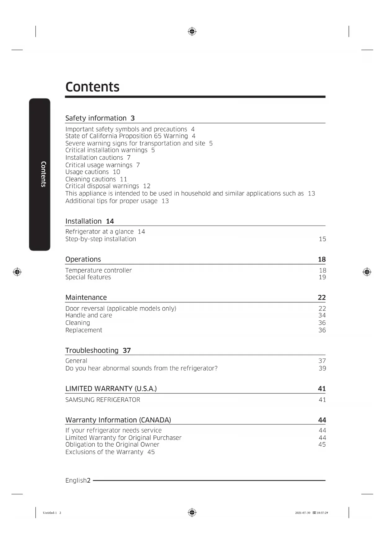 Refrigerator User manual RT16A61**** Free Standing Appliance Untitled-1 1 2021-07-30 10:37:29English2 Contents Contents Safety information 3 Important safety symbols and precautions 4 State of California Proposition 65 Warning 4 Severe warning signs for transportation and site 5 Critical installation warnings 5 Installation cautions 7 Critical usage warnings 7 Usage cautions 10 Cleaning cautions 11 Critical disposal warnings 12 This appliance is intended to be used in household and similar applications such as 13 Additional tips for proper usage 13 Installation 14 Refrigerator at a glance 14 Step-by-step installation 15 Operations 18 Temperature controller 18 Special features 19 Maintenance 22 Door reversal (applicable models only) 22 Handle and care 34 Cleaning 36 Replacement 36 Troubleshooting 37 General 37 Do you hear abnormal sounds from the refrigerator? 39