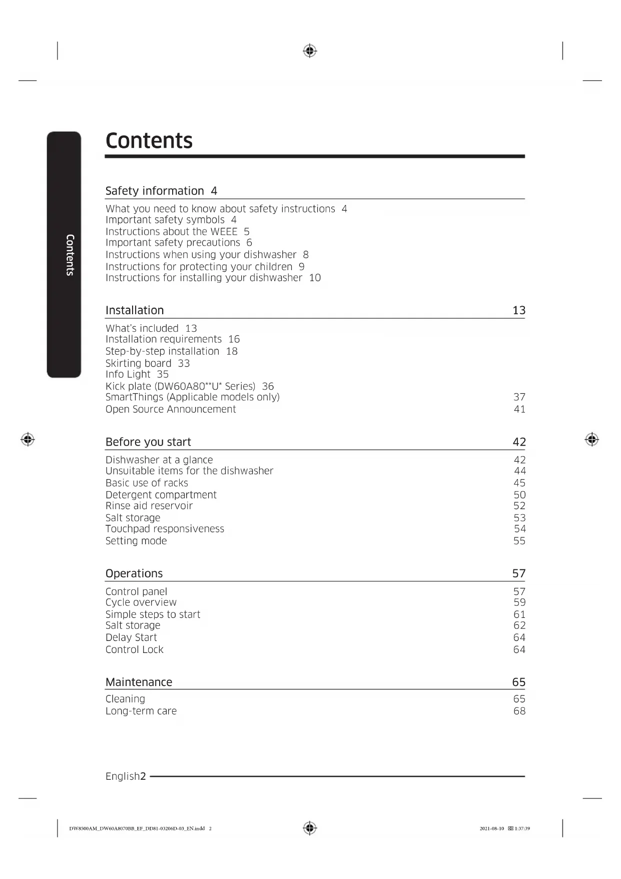 - bed and breakfast type environments. DW8500AM_DW60A8070BB_EF_DD81-03206D-03_EN.indd 7 2021-08-10 1:37:40English8 Safety information Safety information Instructions when using your dishwasher This dishwasher is not designed for commercial use. It is intended for use in domestic households and in similar working and residential environments such as: