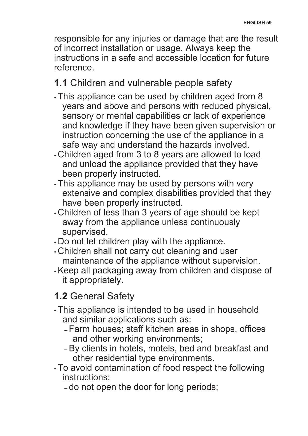 - To avoid contamination of food respect the following instructions: – do not open the door for long periods; ENGLISH 59– clean regularly surfaces that can come in contact with food and accessible drainage systems;