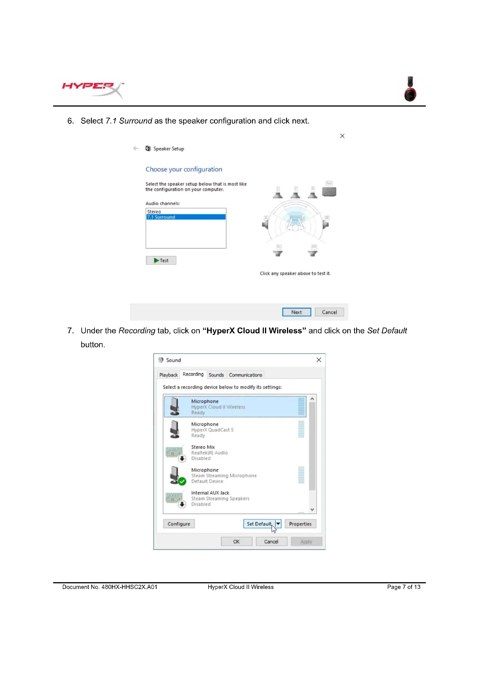 Default Communication Device. Under the Recording tab, verify that “HyperX Cloud II Wireless” is set as Default Device.Document No. 480HX-HHSC2X.A01 HyperX Cloud II Wireless Page 9 of 13