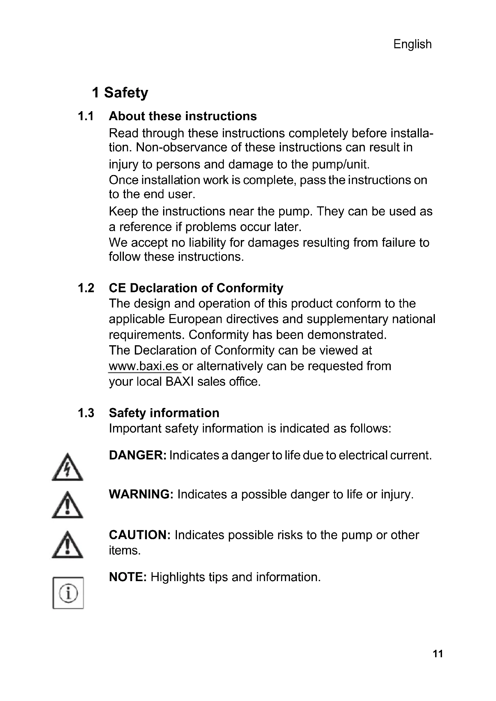 CE Declaration of Conformity The design and operation of this product conform to the applicable European directives and supplementary national requirements. Conformity has been demonstrated. The Declaration of Conformity can be viewed at www.baxi.es or alternatively can be requested from your local BAXI sales office.