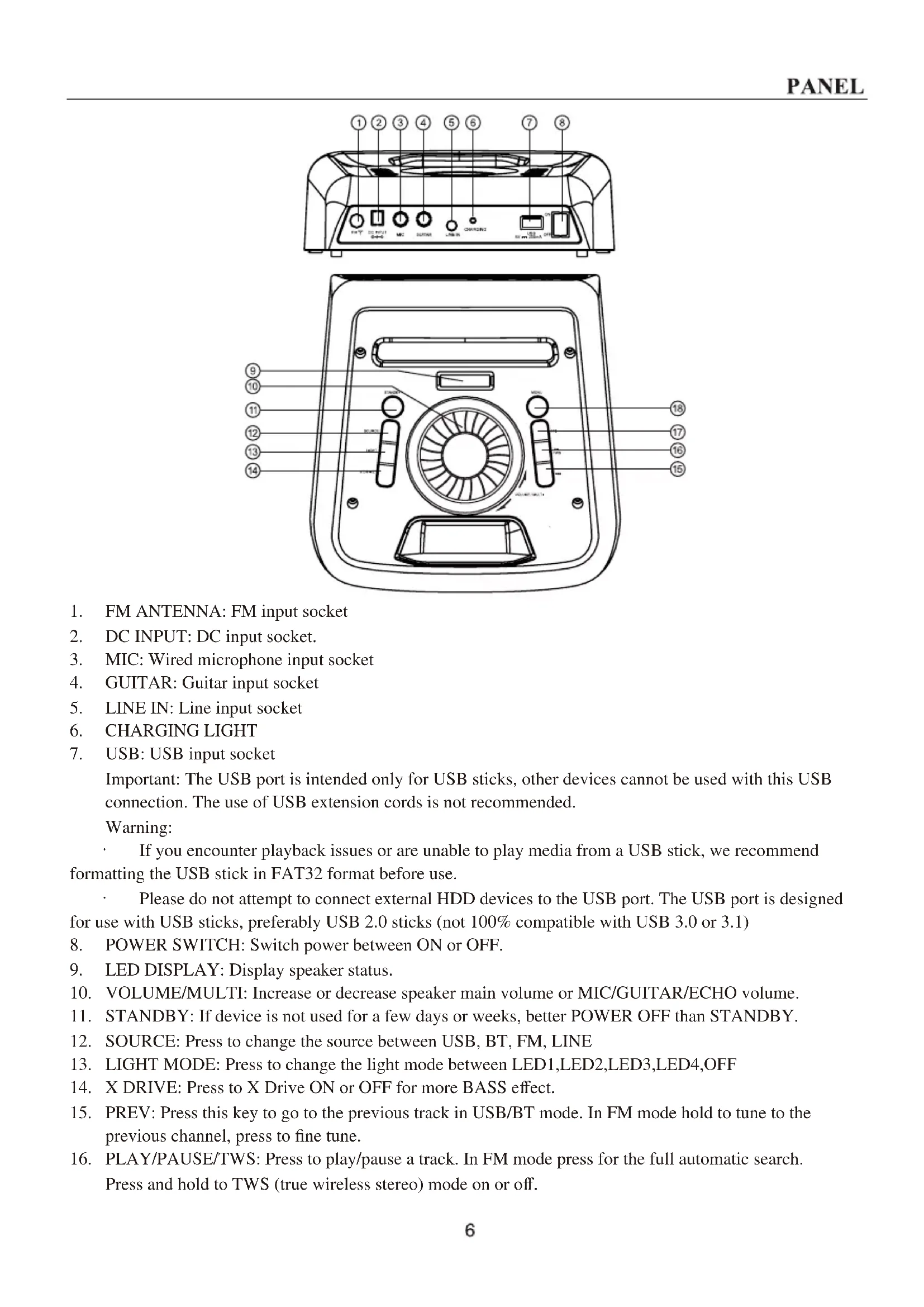 12. SOURCE: Press to change the source between USB, BT, FM, LINE