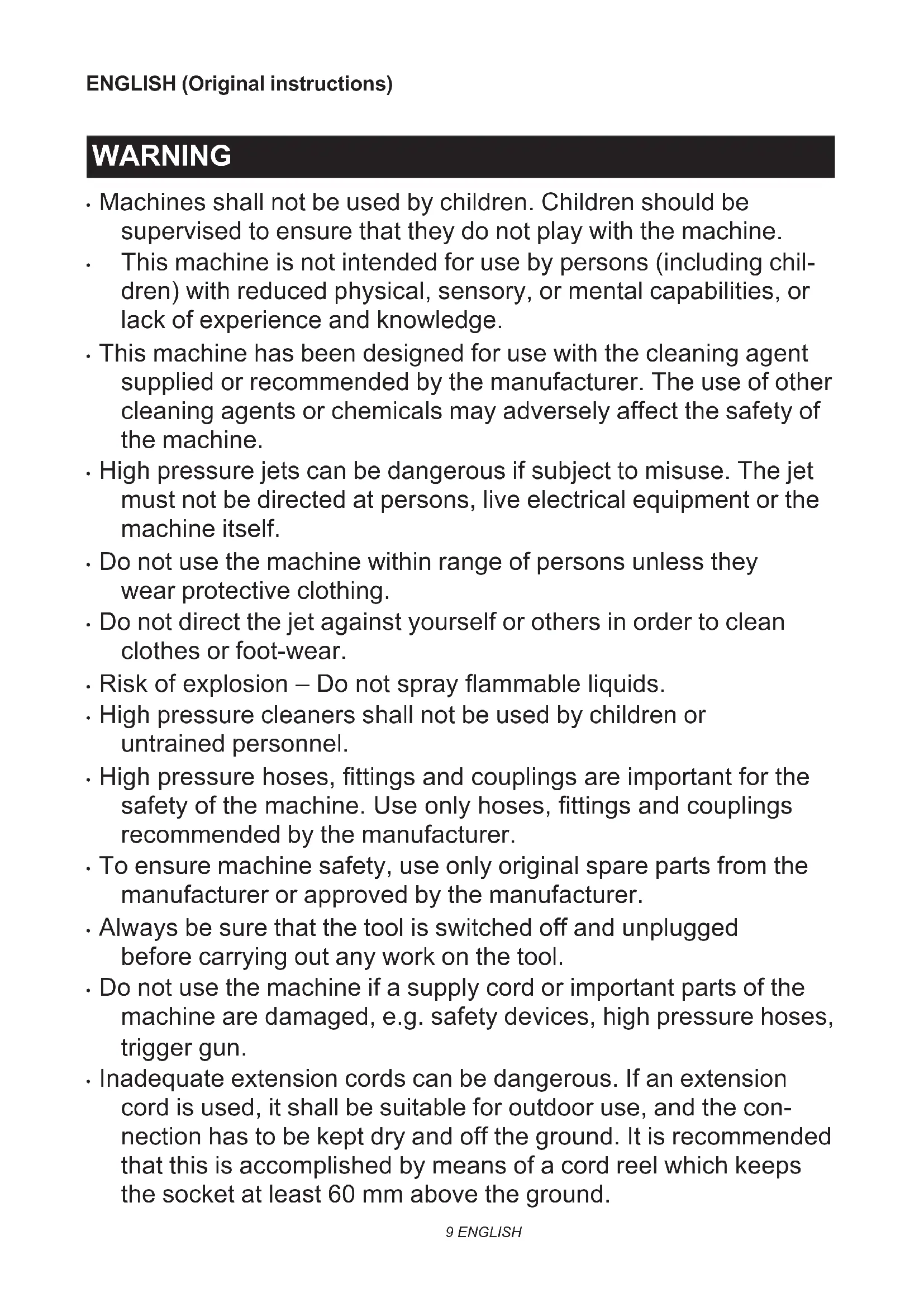 - High pressure jets can be dangerous if subject to misuse. The jet must not be directed at persons, live electrical equipment or the machine itself.