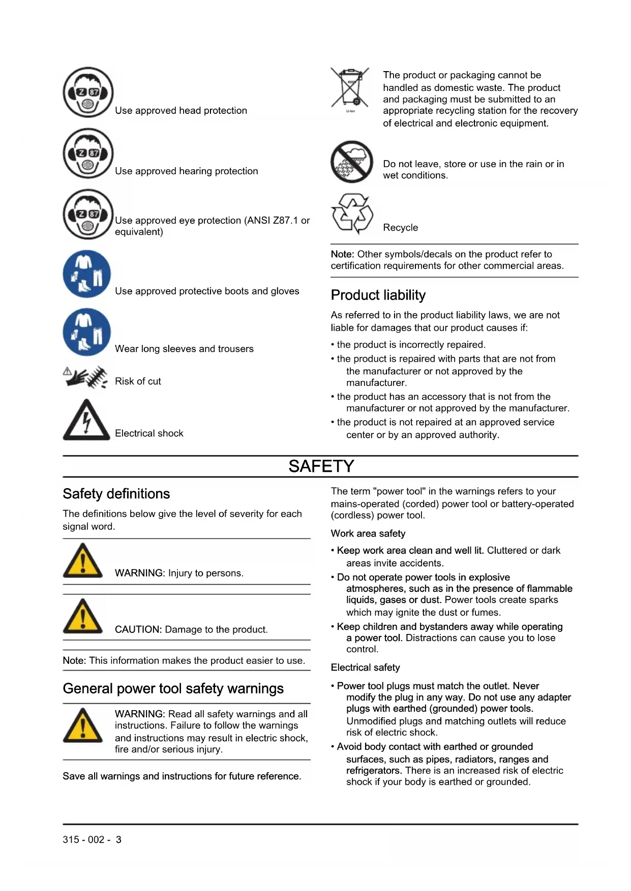 Symbols on the product Warning Read this manual 2 315 - 002 -Use approved head protection Use approved hearing protection Use approved eye protection (ANSI Z87.1 or equivalent) Use approved protective boots and gloves Wear long sleeves and trousers Risk of cut Electrical shock Li-ion The product or packaging cannot be handled as domestic waste. The product and packaging must be submitted to an appropriate recycling station for the recovery of electrical and electronic equipment. Do not leave, store or use in the rain or in wet conditions. Recycle Note: Other symbols/decals on the product refer to certification requirements for other commercial areas. Product liability As referred to in the product liability laws, we are not liable for damages that our product causes if: