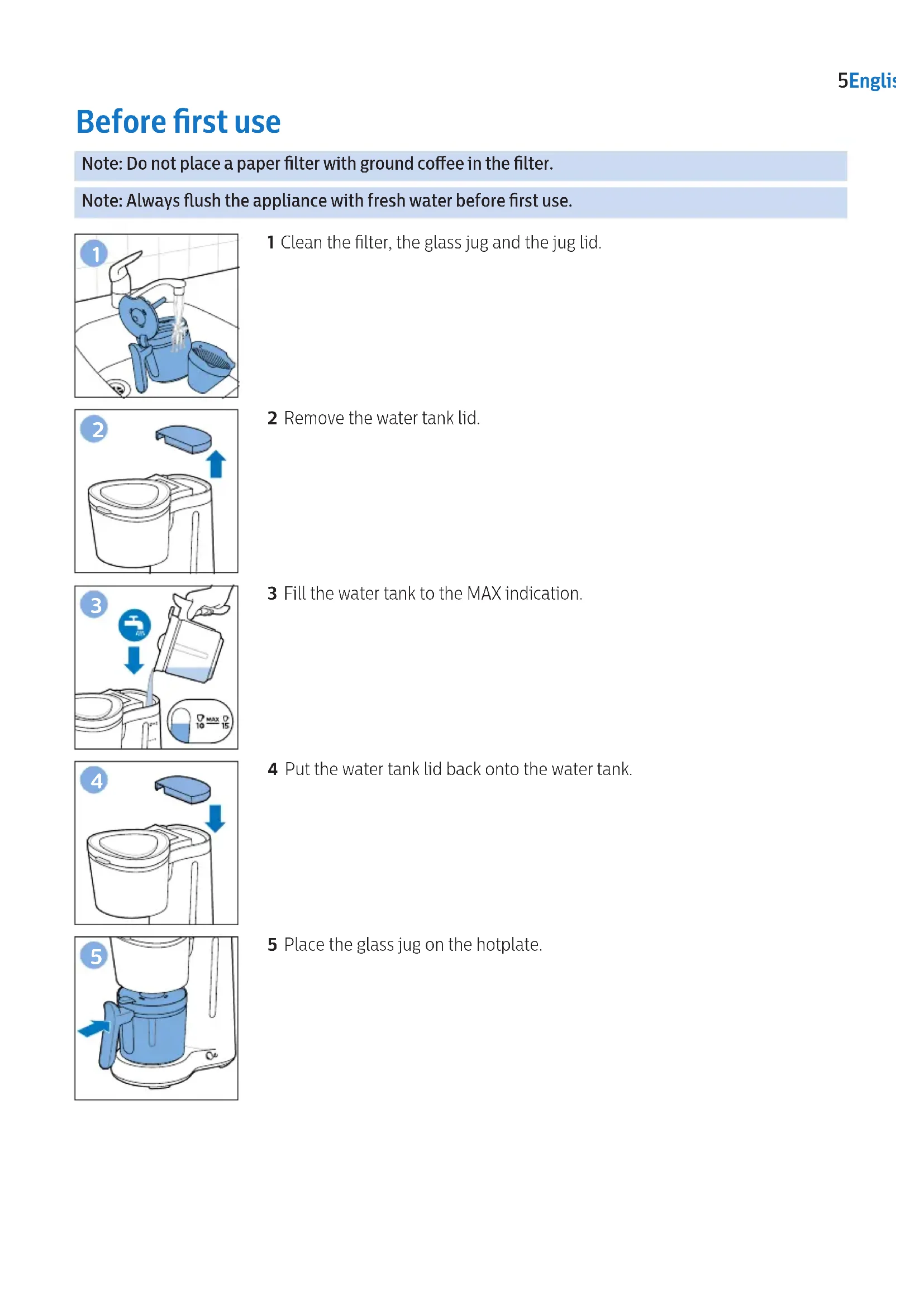 4 EnglishBefore rst use Note: Do not place a paper lter with ground coee in the lter. Note: Always ush the appliance with fresh water before rst use.