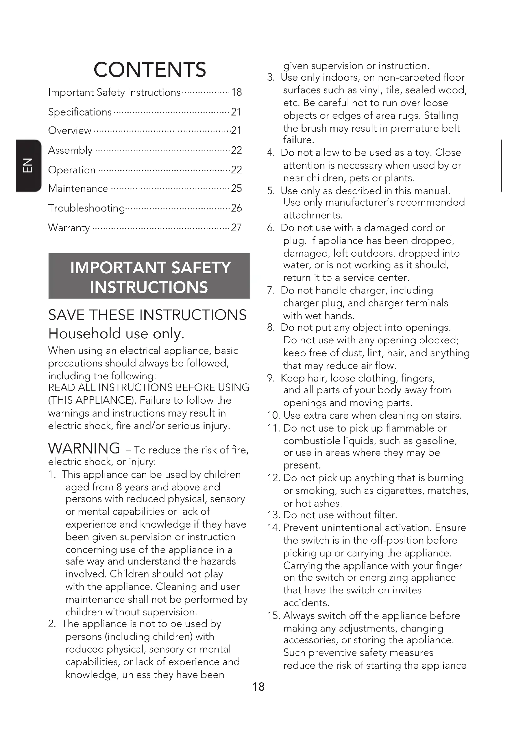 - Use only indoors, on non-carpeted floor surfaces such as vinyl, tile, sealed wood, etc. Be careful not to run over loose objects or edges of area rugs. Stalling the brush may result in premature belt failure.