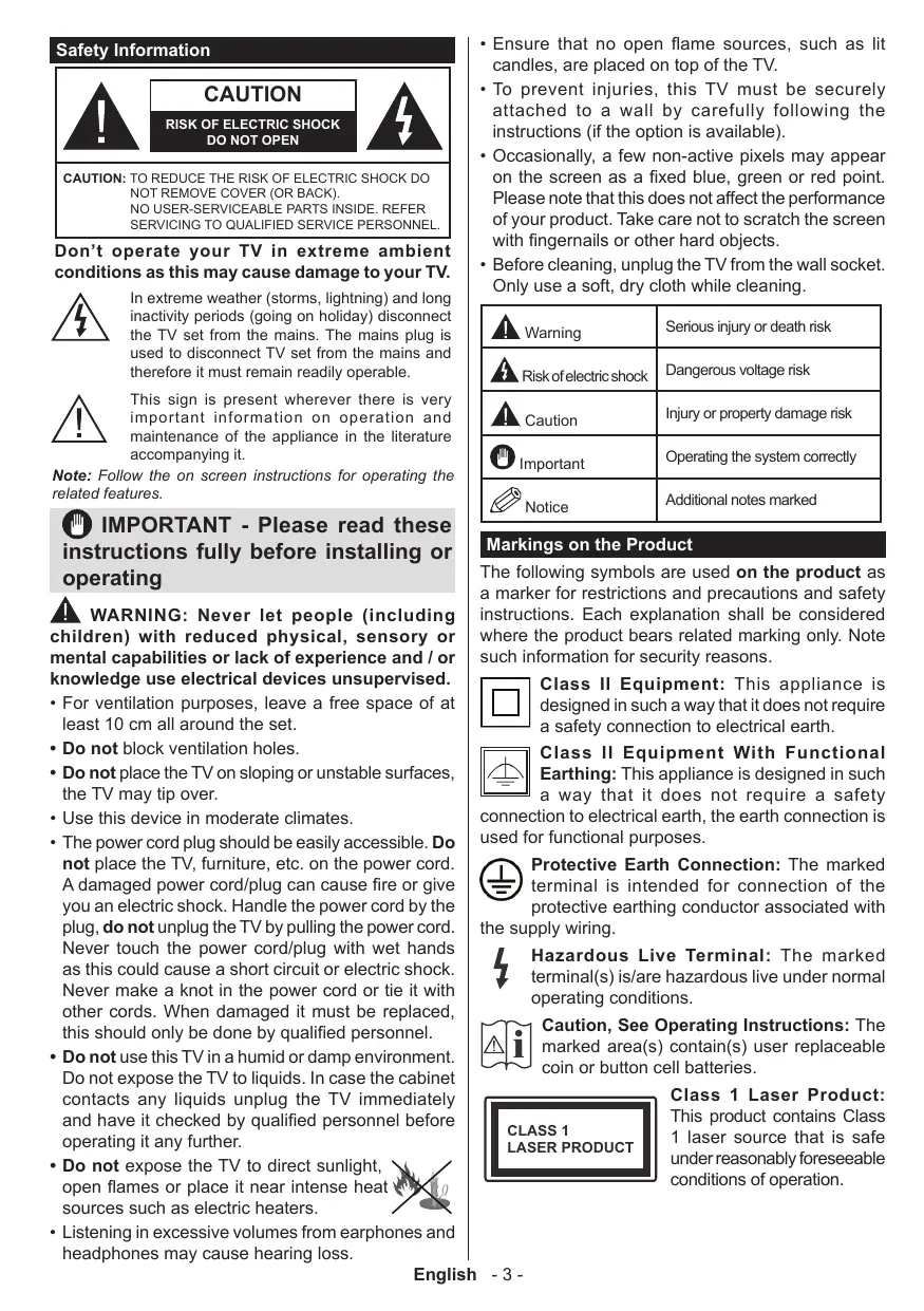 - Before cleaning, unplug the TV from the wall socket. Only use a soft, dry cloth while cleaning. Warning Serious injury or death risk Risk of electric shock Dangerous voltage risk Caution Injury or property damage risk Important Operating the system correctly Notice Additional notes marked Markings on the Product The following symbols are used on the product as a marker for restrictions and precautions and safety instructions. Each explanation shall be considered where the product bears related marking only. Note such information for security reasons.