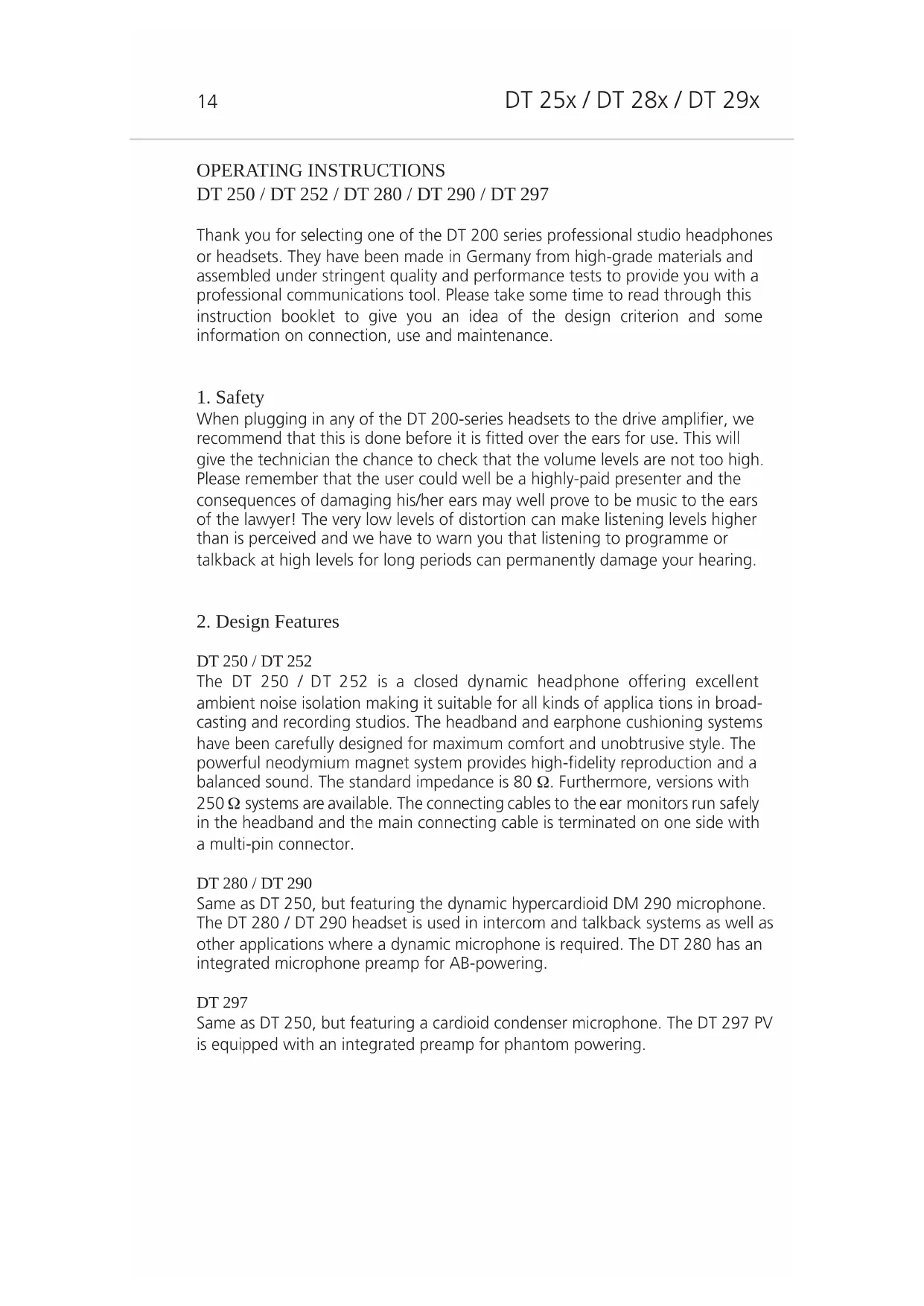 OPERATING INSTRUCTIONS DT 250 / DT 252 / DT 280 / DT 290 / DT 297 Thank you for selecting one of the DT 200 series professional studio headphones or headsets. They have been made in Germany from high-grade materials and assembled under stringent quality and performance tests to provide you with a professional communications tool. Please take some time to read through this instruction booklet to give you an idea of the design criterion and some information on connection, use and maintenance.