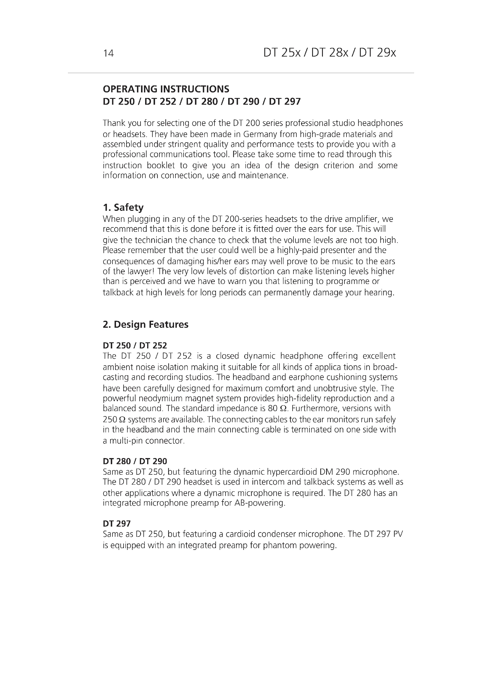 OPERATING INSTRUCTIONS DT 250 / DT 252 / DT 280 / DT 290 / DT 297 Thank you for selecting one of the DT 200 series professional studio headphones or headsets. They have been made in Germany from high-grade materials and assembled under stringent quality and performance tests to provide you with a professional communications tool. Please take some time to read through this instruction booklet to give you an idea of the design criterion and some information on connection, use and maintenance.