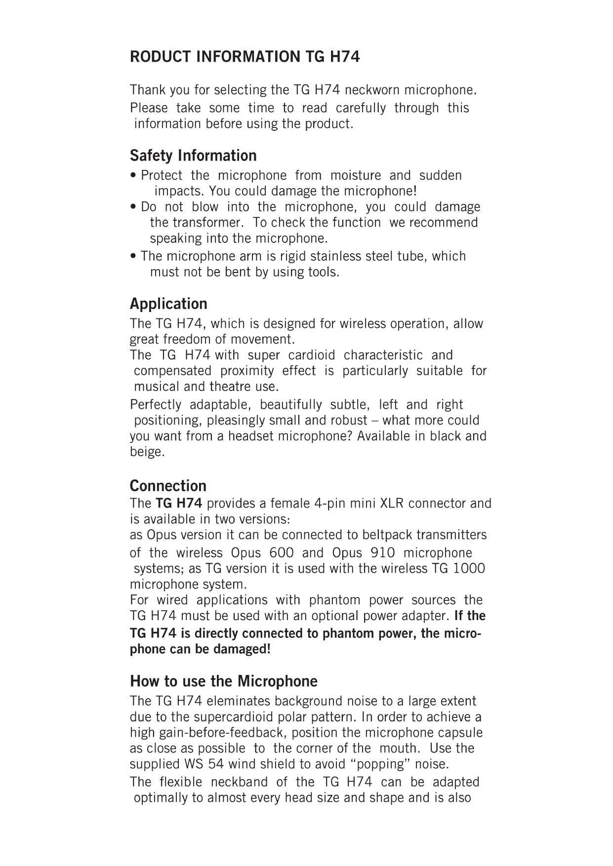- The microphone arm is rigid stainless steel tube, which must not be bent by using tools. Application The TG H74, which is designed for wireless operation, allow great freedom of movement. The TG H74 with super cardioid characteristic and compensated proximity effect is particularly suitable for musical and theatre use. Perfectly adaptable, beautifully subtle, left and right positioning, pleasingly small and robust – what more could you want from a headset microphone? Available in black and beige. Connection The TG H74 provides a female 4-pin mini XLR connector and is available in two versions: as Opus version it can be connected to beltpack transmitters of the wireless Opus 600 and Opus 910 microphone systems; as TG version it is used with the wireless TG 1000 microphone system. For wired applications with phantom power sources the TG H74 must be used with an optional power adapter. If the TG H74 is directly connected to phantom power, the micro- phone can be damaged! How to use the Microphone The TG H74 eleminates background noise to a large extent due to the supercardioid polar pattern. In order to achieve a high gain-before-feedback, position the microphone capsule as close as possible to the corner of the mouth. Use the supplied WS 54 wind shield to avoid “popping” noise. The flexible neckband of the TG H74 can be adapted optimally to almost every head size and shape and is alsoenglish 12 | 13 suitable when wearing spectacles. Make sure that the rigid microphone arm is never bent by using tools! The rotatable and slideable microphone arm allows positioning the micro- phone next to the mouth. The microphone can be worn on the right or left hand side. Attach the microphone arm to the appropriate microphone and cable holder. For transport purposes, the headset can be collapsed and folded inwards. Maintenance Use a soft, damp cloth for cleaning the TG H74 microphone and connecting cable. If necessary, you can use a gentle cleansing agent (such as washing-up liquid). Make sure not to allow any water to enter the microphone capsule and never use any solvent cleansers. The supplied pop shield should regularly be removed from the microphone capsule and cleaned in clear water. Make sure the pop shield is completely dry before it is replaced back onto the microphone.