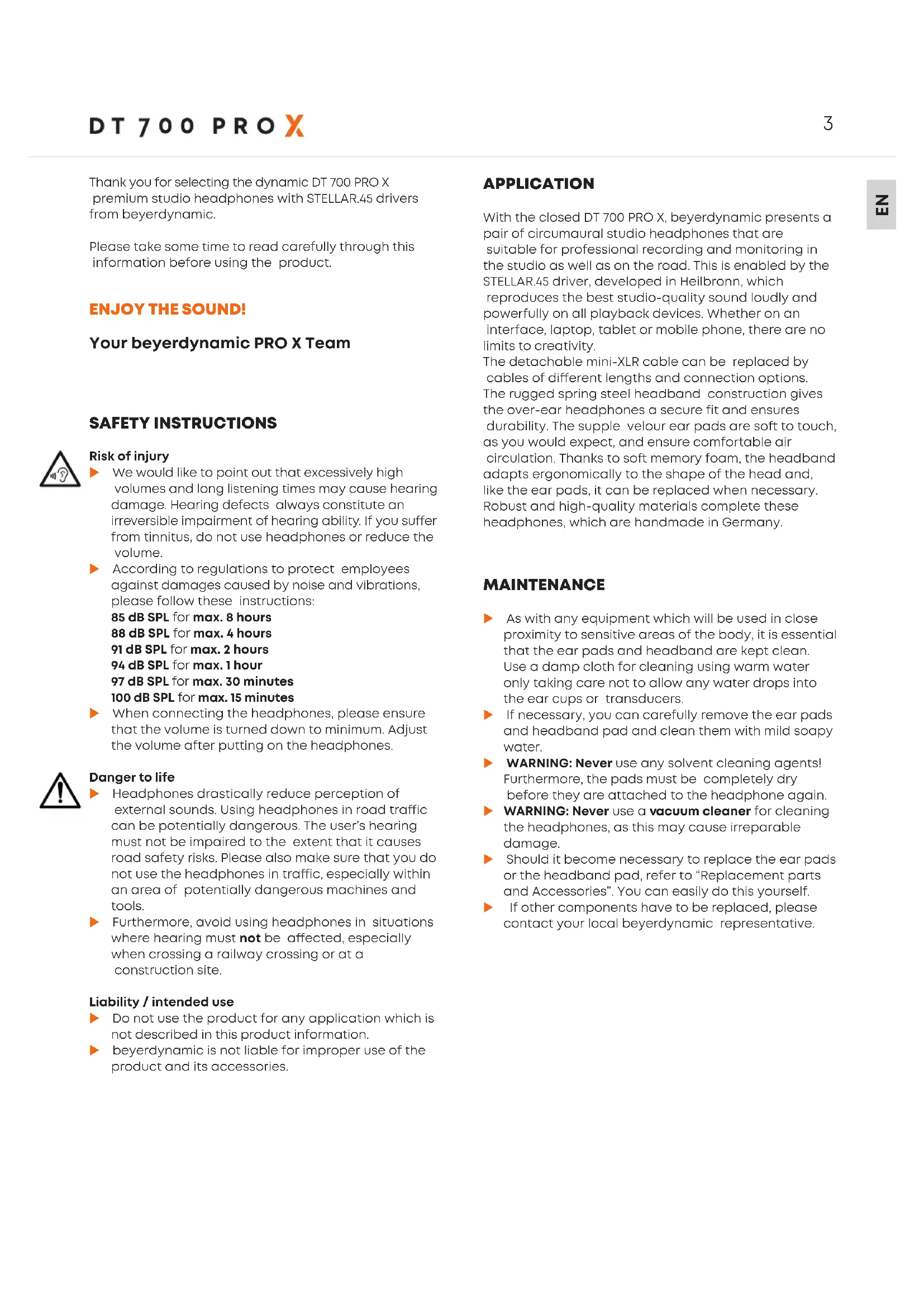 Thank you for selecting the dynamic DT 700 PRO X premium udio headphones with STELLAR.45 drivers from beyerdynamic. Please take some time to read carefully through this information before using the product.