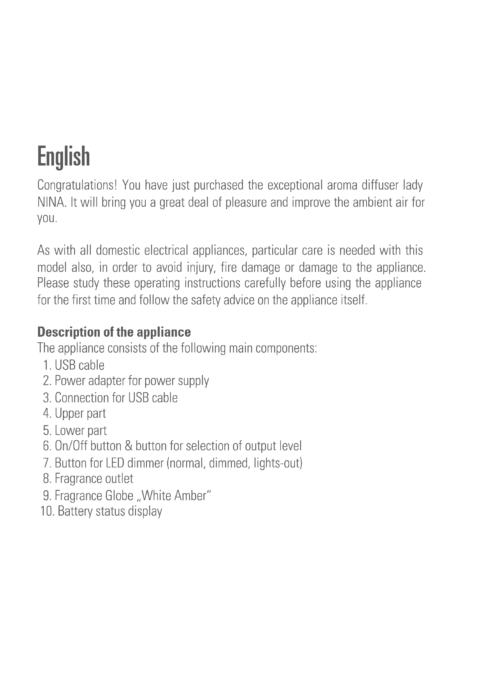 - Battery is charging: LED is illuminated constantly When the device is fully charged, the LED will go out. You can now disconnect the USB cable and use the device in battery mode (for up to 50 hours). Note: There are 6 different fragrance types to choose from in the fragrance globe range: White Amber, Orange Bergamot, Red Jasmine, Blue Rosewood, Black Orchid, Yellow Vanilla. You can buy the fragrance globes from the same place you bought your Nina.Cleaning Before maintenance and after every use, switch the device off and pull the net- work adapter out of the socket. Careful: Never immerse the device in water (danger of short circuit).