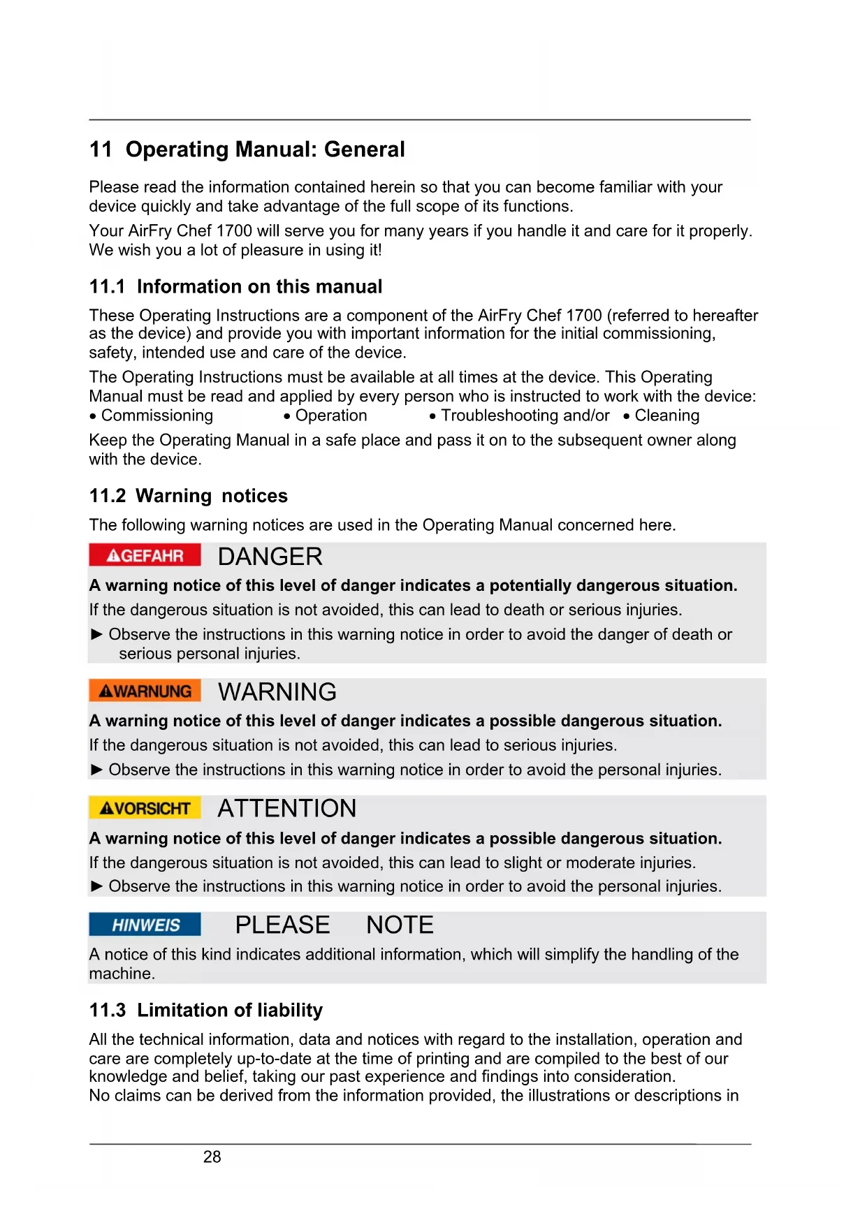 These Operating Instructions are a component of the AirFry Chef 1700 (referred to hereafter as the device) and provide you with important information for the initial commissioning, safety, intended use and care of the device. The Operating Instructions must be available at all times at the device. This Operating Manual must be read and applied by every person who is instructed to work with the device: Commissioning Operation Troubleshooting and/or Cleaning Keep the Operating Manual in a safe place and pass it on to the subsequent owner along with the device.