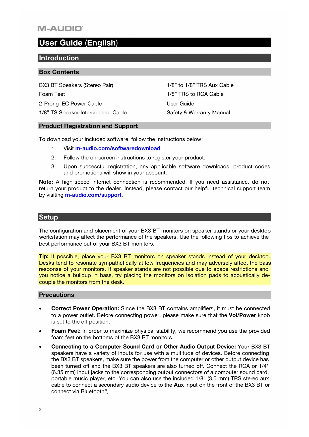 User Guide (English) Introduction Box Contents BX3 BT Speakers (Stereo Pair) Foam Feet 2-Prong IEC Power Cable 1/8” TS Speaker Interconnect Cable 1/8” to 1/8” TRS Aux Cable 1/8” TRS to RCA Cable User Guide Safety & Warranty Manual Product Registration and Support To download your included software, follow the instructions below: