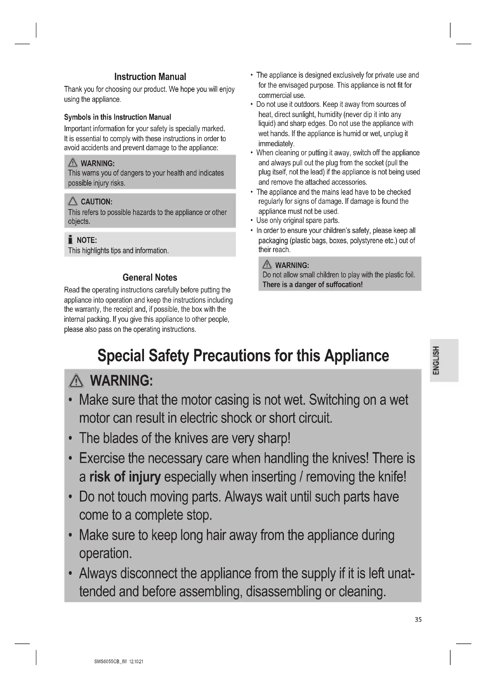 - Ensure that the mains power cable does not touch hot surfaces (e. g. hot pots). Intended Use This appliance can be used to mix, beat, puree or crush foodstuffs. It is for instance suitable for preparing mayon- naise, dips, sauces, soups, baby food and milkshakes. The appliance is intended for amounts common in the private household. It is intended for the use in private households and similar applications. It is only to be used as instructed in this user manual. The appliance is not intended for commercial use.SMS6055CB_IM 12.10.21