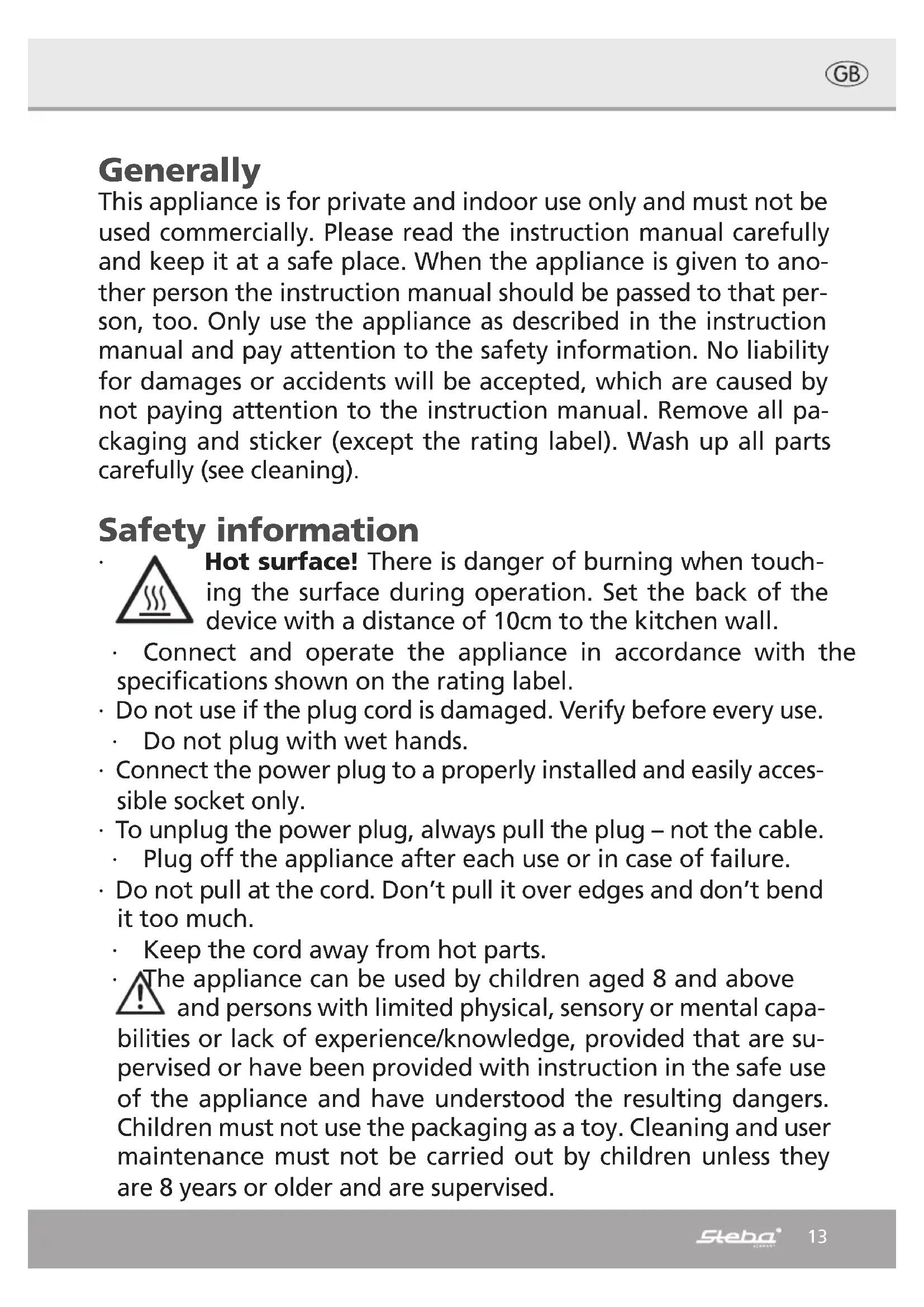 Attention! Device gets hot. Danger of burns! Do not place the appliance on a sensitive surface (e.g. painted furniture) and keep a distance of at least 70cm to burn-15 able materials. ∙ During operation steam emerge. Keep hands and face away. Take appropriate distance to wall cupboards to avoid damage of the veneer. ∙ If an extension cable is used, it has to have a cross-section of 1,5mm². A cable drum must always be unwound. ∙ If a GS-tested 16 A multi-pin extension is used, it may not be charged with more than 3680 watts due to fire hazard. ∙ Make sure that children do not tease the cable or that a trip hazard occurs. ∙ The device must always be disconnected from the power supply if it is not supervised and before assembling, disassembling or cleaning.