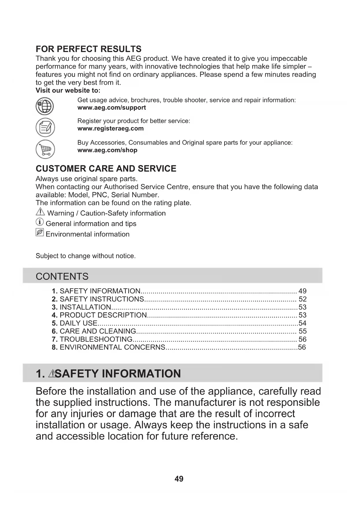 Thank you for choosing this AEG product. We have created it to give you impeccableperformance for many years, with innovative technologies that help make life simpler –features you might not find on ordinary appliances. Please spend a few minutes readingto get the very best from it.Visit our website to:Get usage advice, brochures, trouble shooter, service and repair information:www.aeg.com/supportRegister your product for better service:www.registeraeg.comBuy Accessories, Consumables and Original spare parts for your appliance:www.aeg.com/shop
