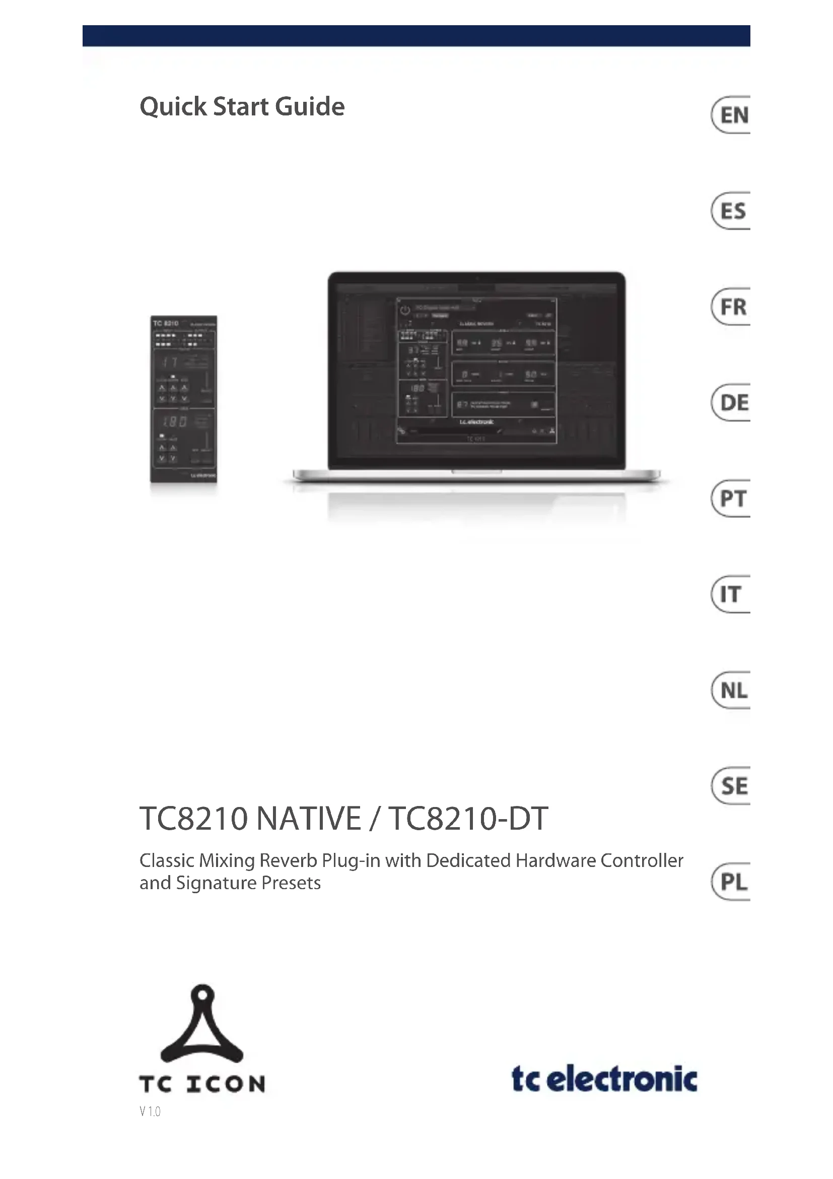OGRANICZONA GWARANCJA Ważne informacje o bezpieczeństwie20 TC8210 21Quick Start Guide Thank you for purchasing the TC8210 classic reverb. Read through this Quick Start Guide to get things set up, and don’t forget to download the full manual from tcelectronic.com for all the in-depth explanations. Software Download and Installation The combined TC8210 plug-in installer for both the NATIVE and DT Desktop Controller products can be downloaded from the following page: www.tcelectronic.com/TC8210-dt/support/ The TC8210 plug-in requires either an active PACE iLok license (when buying the NATIVE version) or a connected Desktop Controller (when you have purchased the DT version). All parameters are available in the plug-in. Save the installer le (.pkg or .msi le) in a convenient location on your hard drive. Double click the installer and follow the instructions to install the plug-in. Activate your TC8210 iLok license (when you have purchased the NATIVE version) Step 1: Install iLok The rst step is to create an iLok user account at www.iLok.com and install the PACE iLok License Manager on your computer if it’s your rst time using iLok. Step 2: Activation In the received mail (when buying the NATIVE version) you will nd your personal Activation Code. To activate your software, please use the Redeem an Activation Code feature in the PACE iLok License Manager. Get a Free Demo License Make use of this hassle-free oer to try out our plug-ins before you buy.