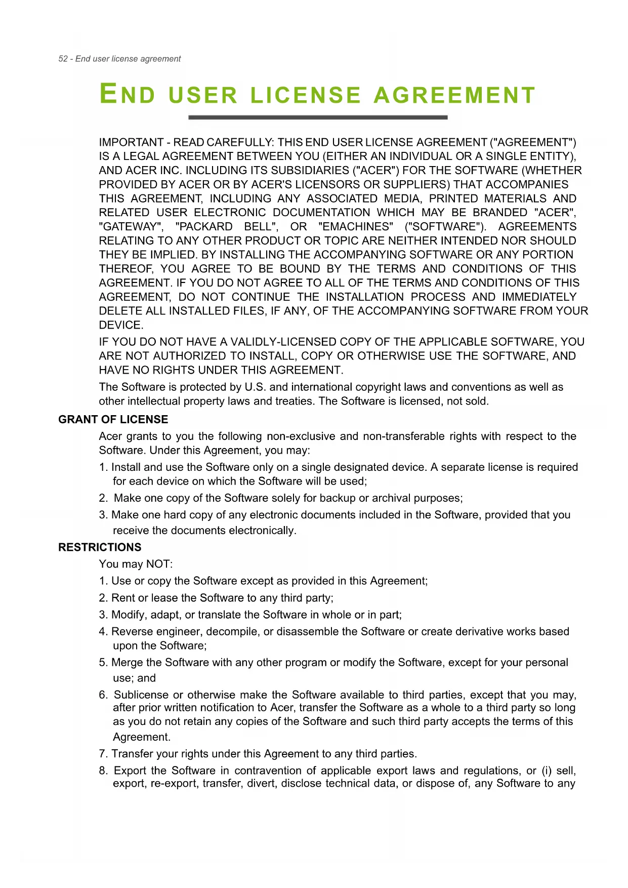 IMPORTANT - READ CAREFULLY: THIS END USER LICENSE AGREEMENT ("AGREEMENT") IS A LEGAL AGREEMENT BETWEEN YOU (EITHER AN INDIVIDUAL OR A SINGLE ENTITY), AND ACER INC. INCLUDING ITS SUBSIDIARIES ("ACER") FOR THE SOFTWARE (WHETHER PROVIDED BY ACER OR BY ACER'S LICENSORS OR SUPPLIERS) THAT ACCOMPANIES THIS AGREEMENT, INCLUDING ANY ASSOCIATED MEDIA, PRINTED MATERIALS AND RELATED USER ELECTRONIC DOCUMENTATION WHICH MAY BE BRANDED "ACER", "GATEWAY", "PACKARD BELL", OR "EMACHINES" ("SOFTWARE"). AGREEMENTS RELATING TO ANY OTHER PRODUCT OR TOPIC ARE NEITHER INTENDED NOR SHOULD THEY BE IMPLIED. BY INSTALLING THE ACCOMPANYING SOFTWARE OR ANY PORTION THEREOF, YOU AGREE TO BE BOUND BY THE TERMS AND CONDITIONS OF THIS AGREEMENT. IF YOU DO NOT AGREE TO ALL OF THE TERMS AND CONDITIONS OF THIS AGREEMENT, DO NOT CONTINUE THE INSTALLATION PROCESS AND IMMEDIATELY DELETE ALL INSTALLED FILES, IF ANY, OF THE ACCOMPANYING SOFTWARE FROM YOUR DEVICE. IF YOU DO NOT HAVE A VALIDLY-LICENSED COPY OF THE APPLICABLE SOFTWARE, YOU ARE NOT AUTHORIZED TO INSTALL, COPY OR OTHERWISE USE THE SOFTWARE, AND HAVE NO RIGHTS UNDER THIS AGREEMENT. The Software is protected by U.S. and international copyright laws and conventions as well as other intellectual property laws and treaties. The Software is licensed, not sold.